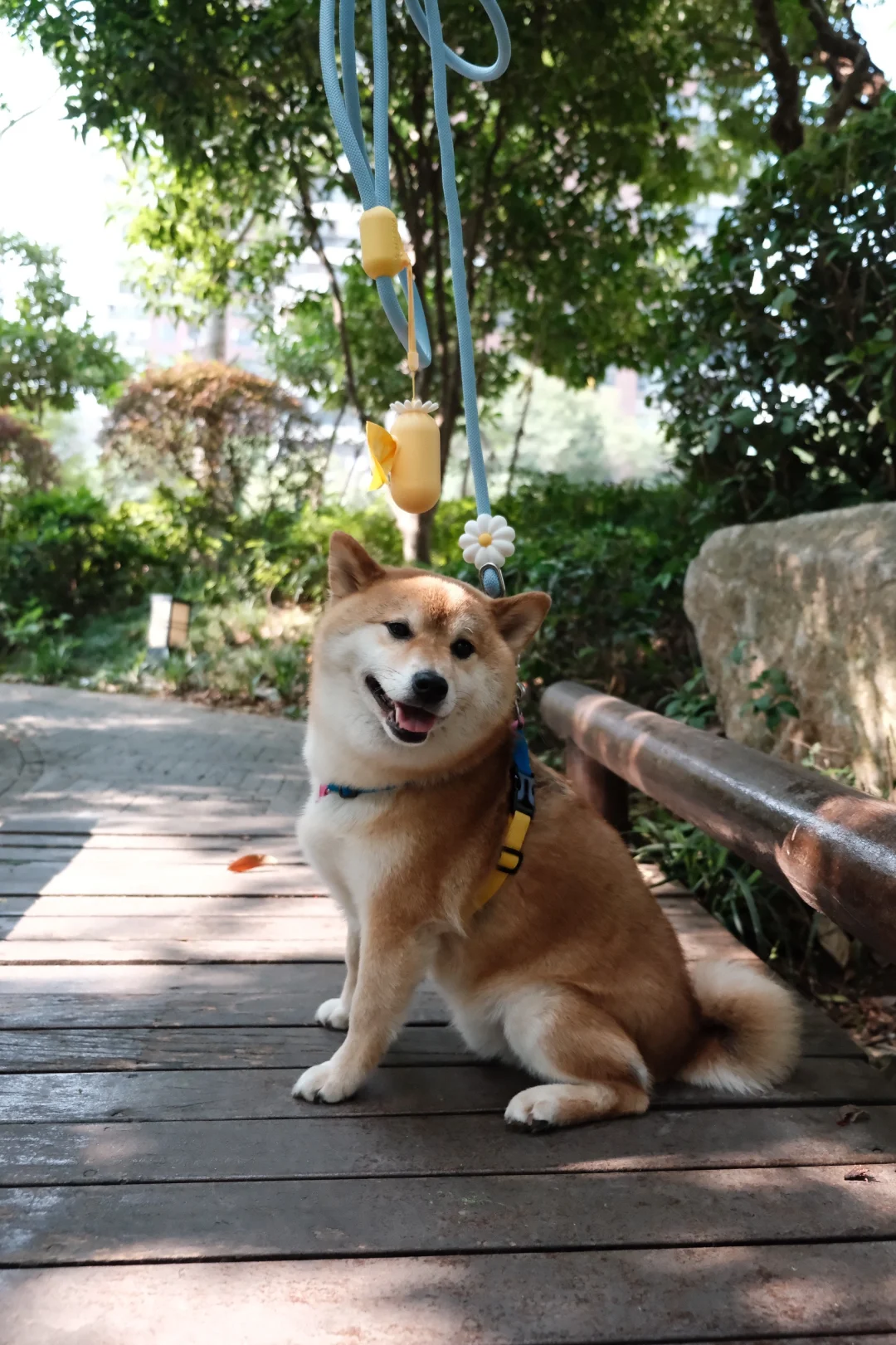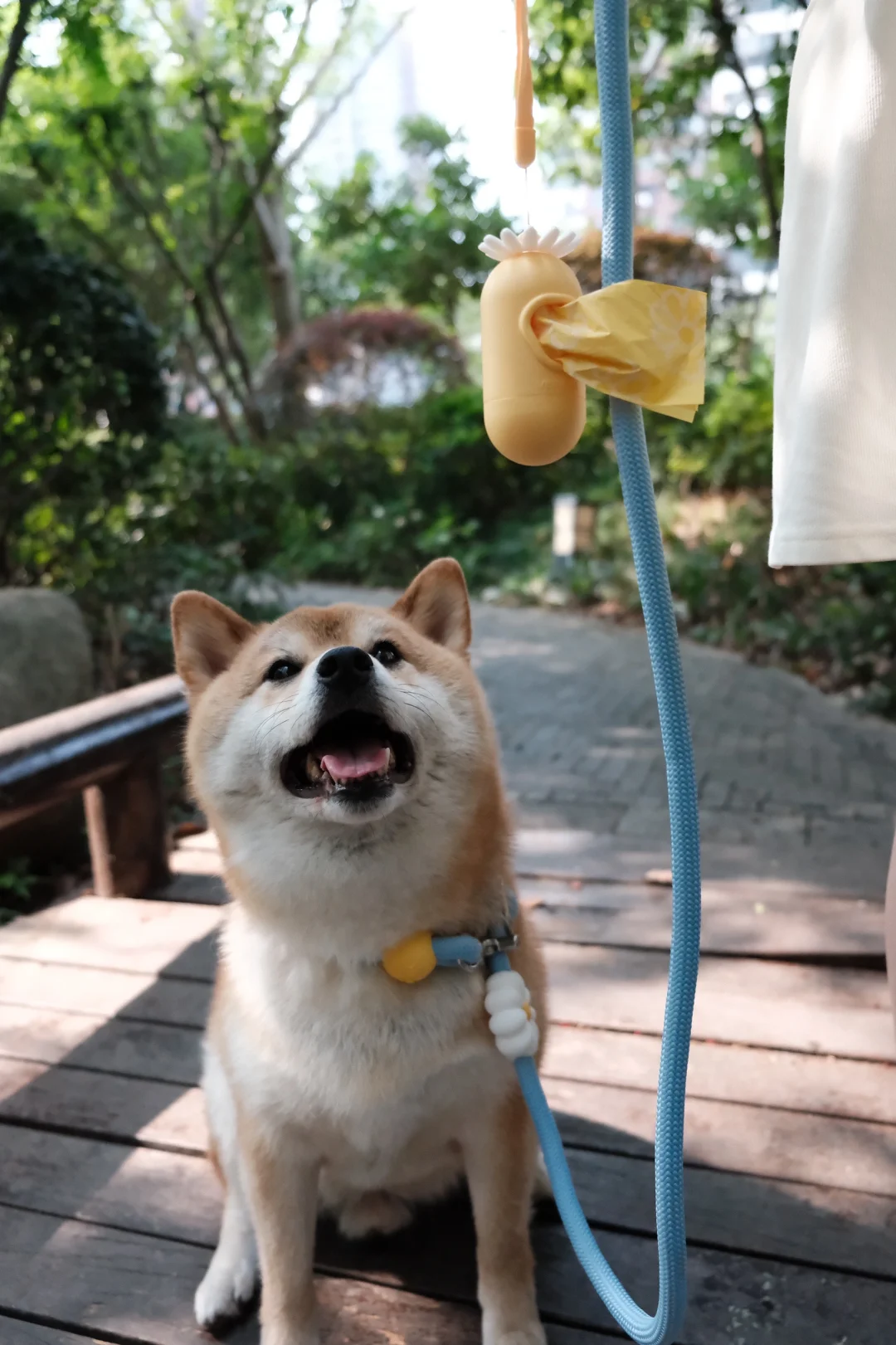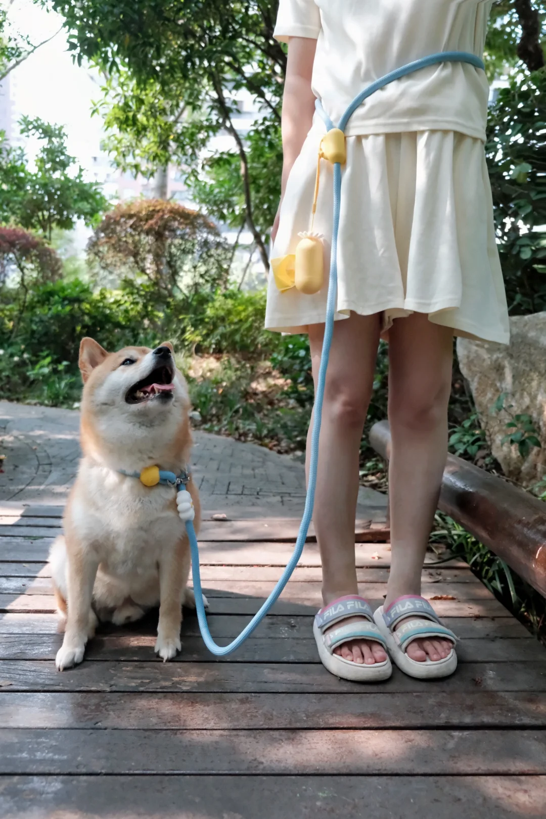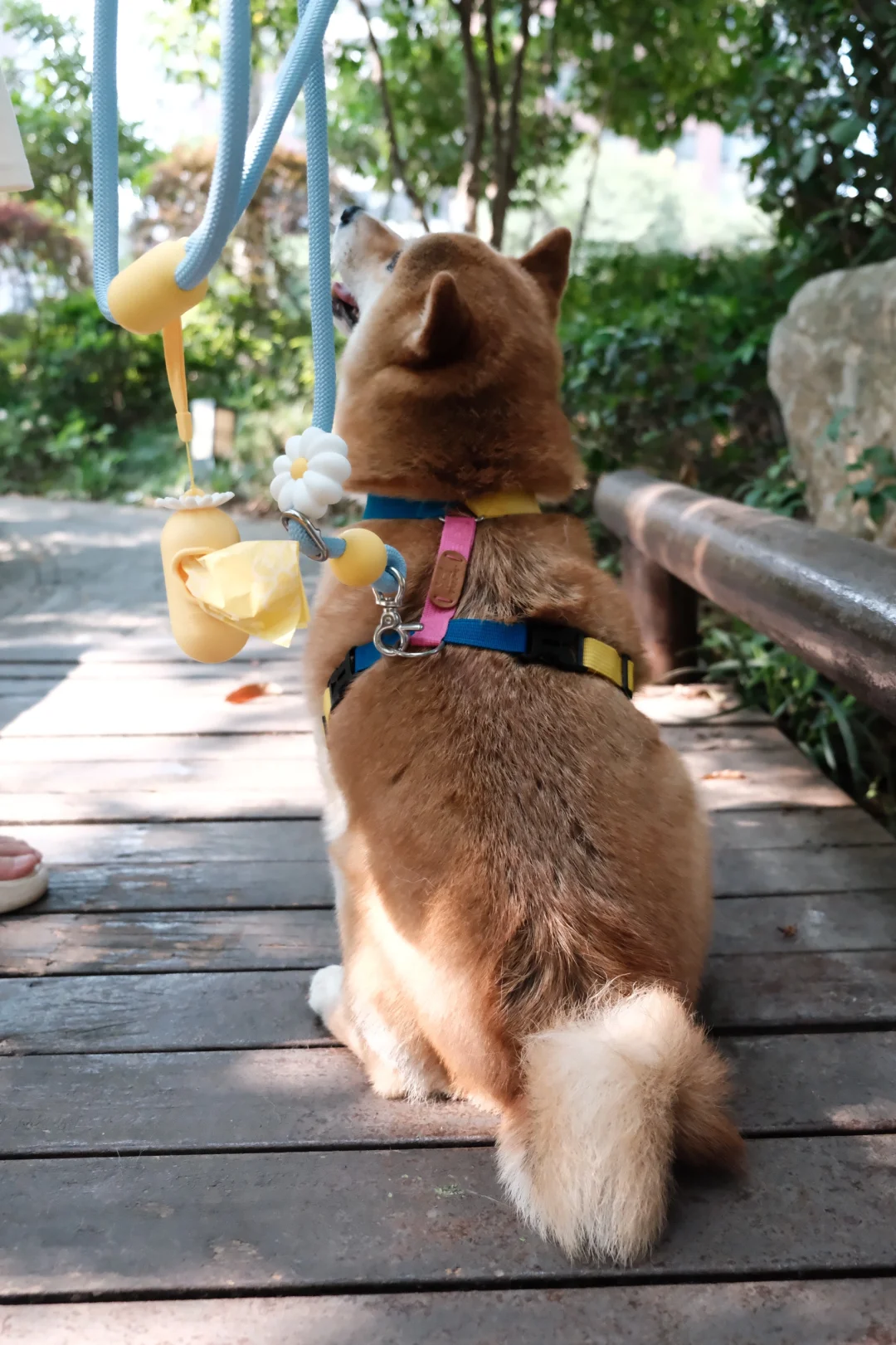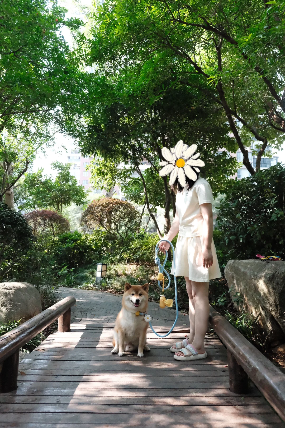 小狗的夏日新装备~黄蓝配色超级夏日清新🐳🌼 天气太热遛狗太热了就想试一下p绳,狗凉快而且这个斜挎的功能还可以解放双手。 配套的小雏菊拾便袋很香,再也不用担心捡完💩手会臭了🙌🙌