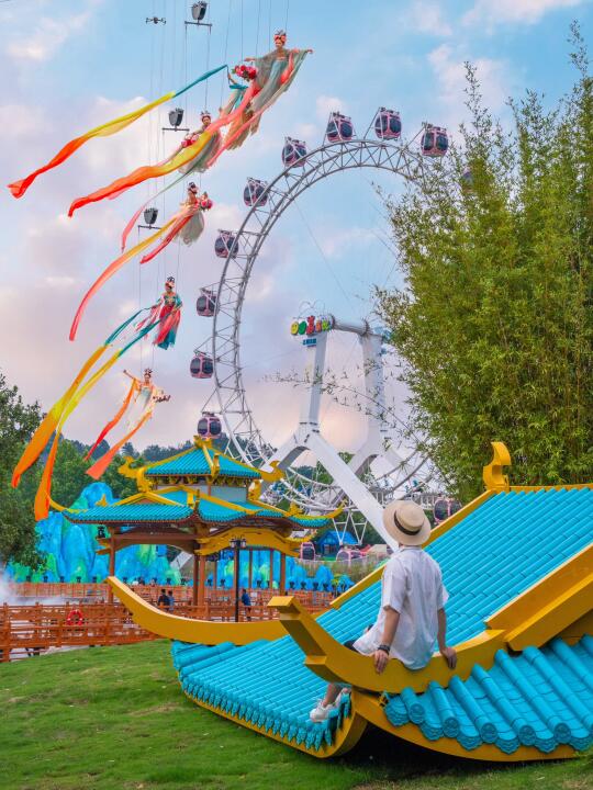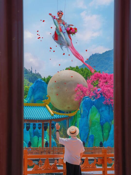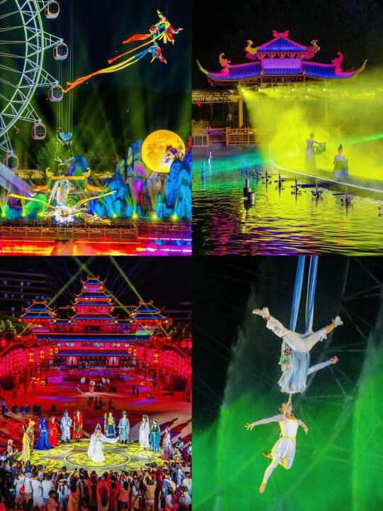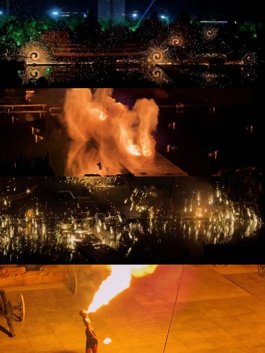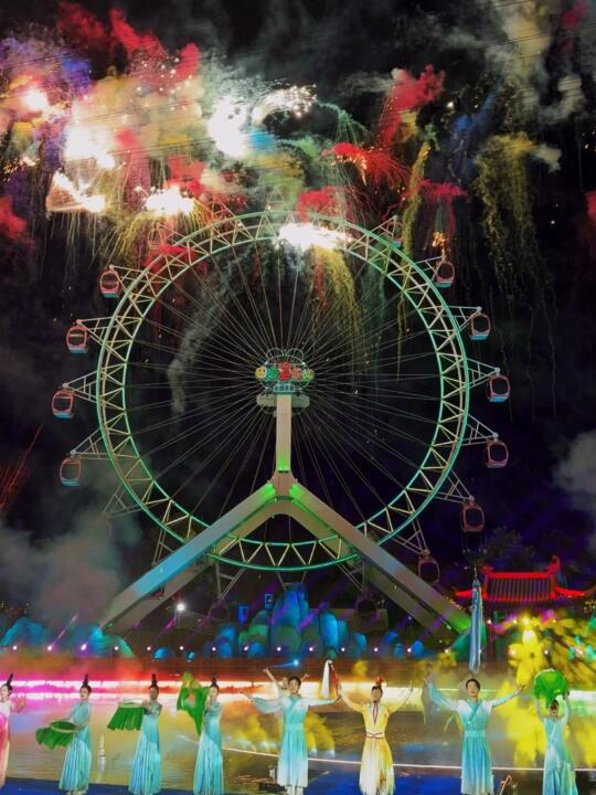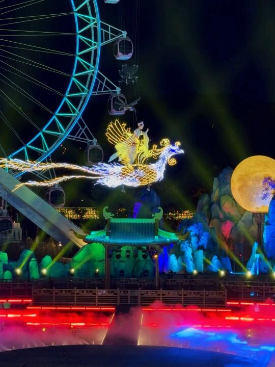 夜幕降临仙女乘着巨型凤凰从摩天轮上方飞来飞去,撒落了花瓣,有灯光音乐加入的这一幕太美了~还有非遗火壶