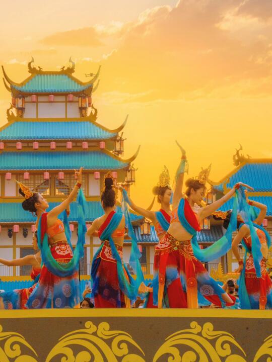 全场都是光影➕3D特效打造的实景水幕秀,演绎白娘子与许仙的千年之恋,结束时以七彩祥云烟花秀收尾,震撼夺目~