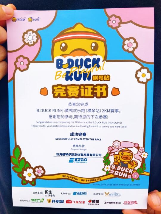 最爽的是选手装备包‼️虽然要自费,但里面的鸭鸭T恤、鸭鸭毛巾和鸭鸭奖牌🏅太萌了~领完赛证书时,工作人员还夸我“跑得超有范儿”~😝