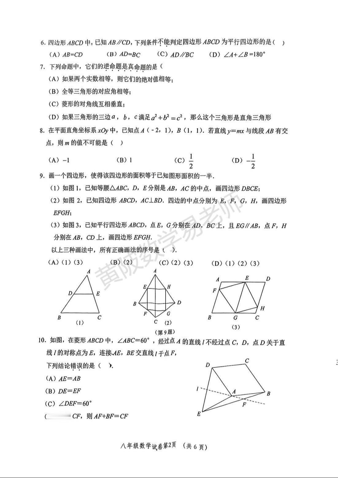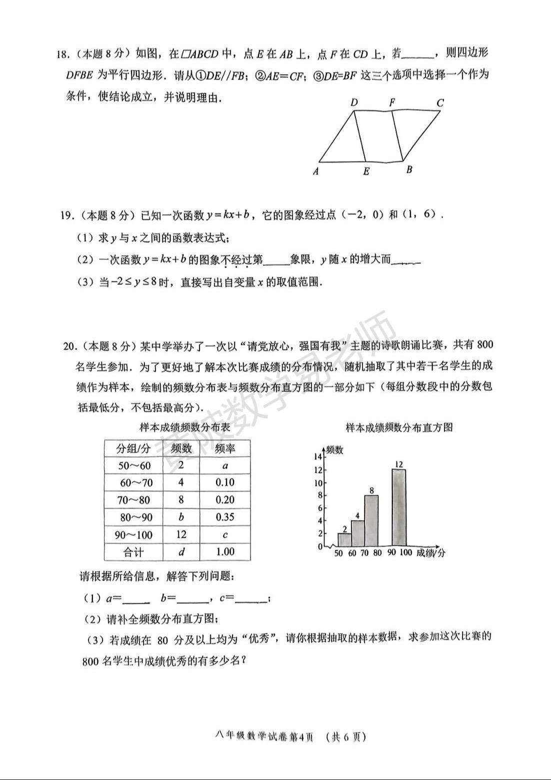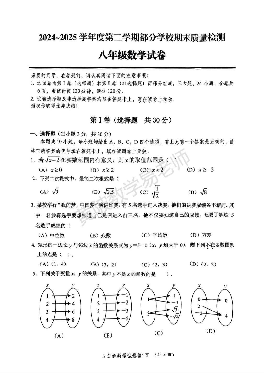 2025年黄陂区八下数学期末卷及答案。八下数学