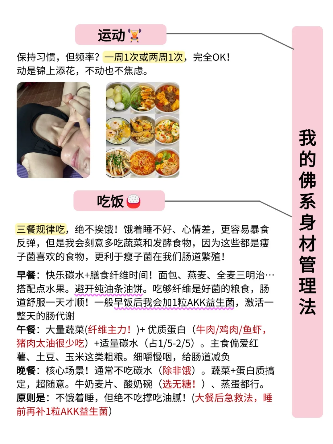 吃饭🍚:三餐规律吃,绝不挨饿!饿着睡不好、心情差,更容易暴食反弹,但是我会刻意多吃蔬菜和发酵食物,因为这些都是瘦子菌喜欢的食物!