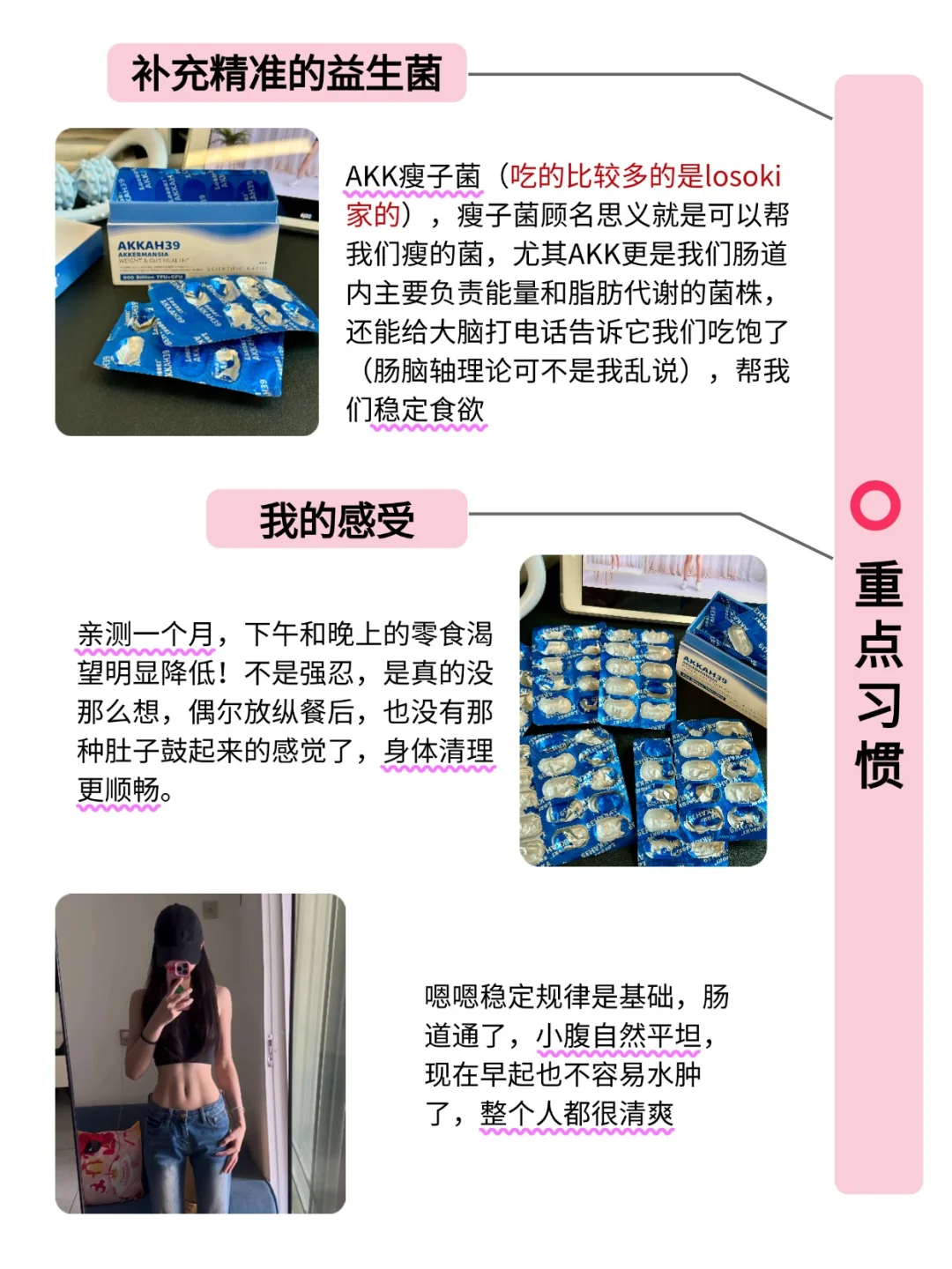 补充精准的益生菌——AKK瘦子菌(吃的比较多的是losoki家的),瘦子菌顾名思义就是可以帮我们瘦的菌,尤其AKK更是我们肠道内主要负责能量和代谢的菌株,还能给大脑打电话告诉它我们吃饱了(肠脑轴理论可不是我乱说),帮我们稳定食欲