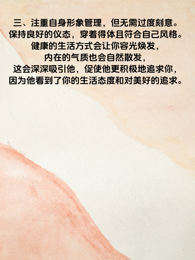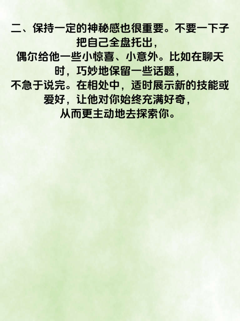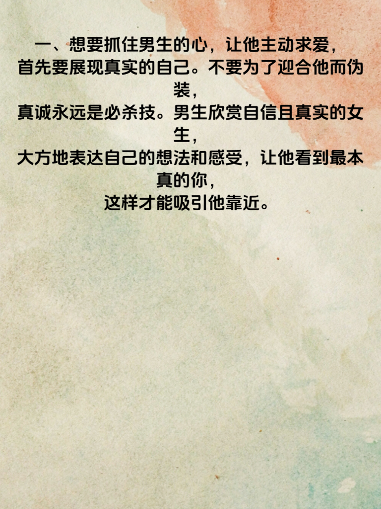 一、想要抓住男生的心,让他主动求爱,首先要展现真实的自己。不要为了迎合他而伪装,真诚永远是必杀技。男生欣赏自信且真实的女生,大方地表达自己的想法和感受,让他看到最本真的你,这样才能吸引他靠近。 二、保持一定的神秘感也很重要。不要一下子把自己全盘托出,偶尔给他一些小惊喜、小意外。比如在聊天时,巧妙地保留一些话题,不急于说完。在相处中,适时展示新的技能或爱好,让他对你始终充满好奇,从而更主动地去探索你。 三、注重自身形象管理,但无需过度刻意。保持良好的仪态,穿着得体且符合自己风格。健康的生活方式会让你容光焕发,内在的气质也会自然散发,这会深深吸引他,促使他更积极地追求你,因为他看到了你的生活态度和对美好的追求。