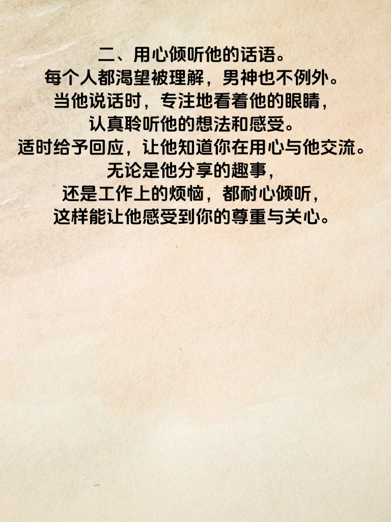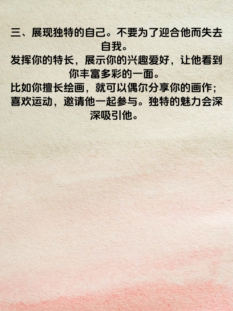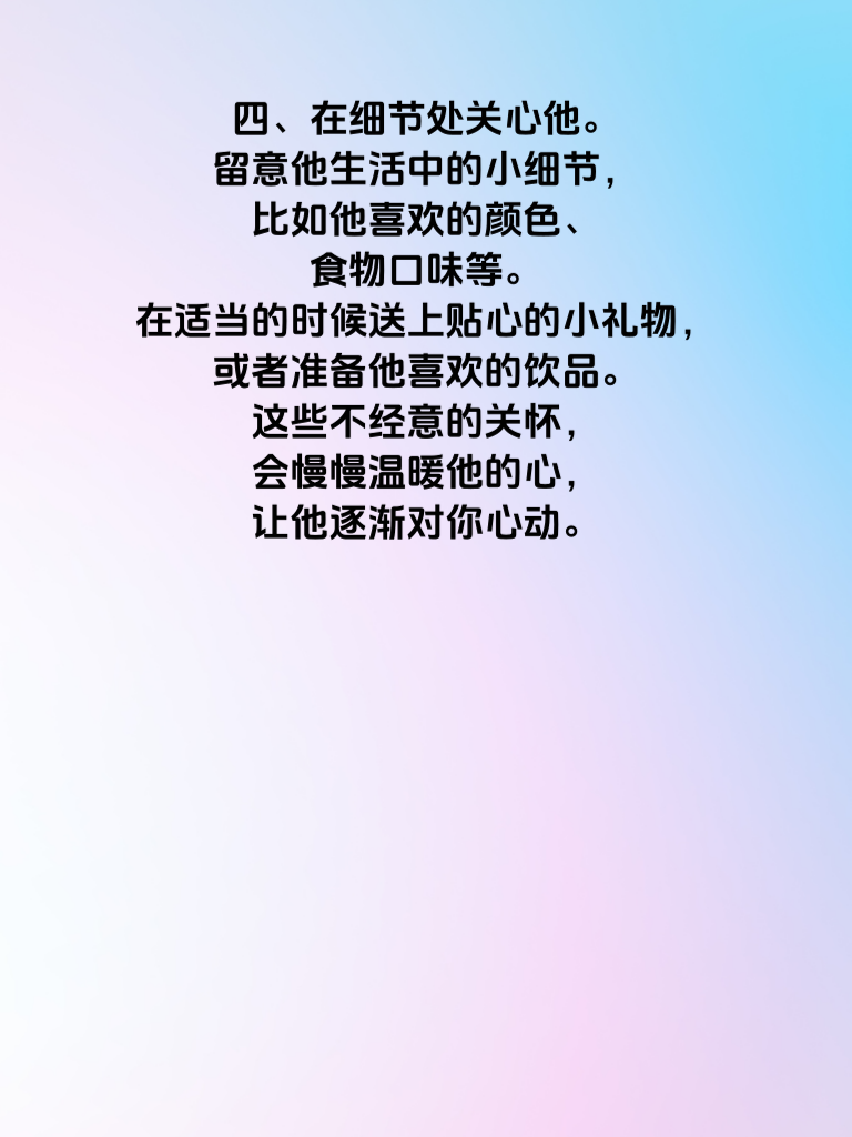 一、真诚的微笑是开启他心门的钥匙。当你与男神相遇,一个真诚灿烂的微笑能瞬间拉近你们的距离。它传递出你的友善与亲和力,让他在人群中轻易注意到你。比如在课堂上、工作场合,或者偶然的相遇,微笑着打个招呼,会给他留下美好的第一印象。 二、用心倾听他的话语。每个人都渴望被理解,男神也不例外。当他说话时,专注地看着他的眼睛,认真聆听他的想法和感受。适时给予回应,让他知道你在用心与他交流。无论是他分享的趣事,还是工作上的烦恼,都耐心倾听,这样能让他感受到你的尊重与关心。 三、展现独特的自己。不要为了迎合他而失去自我。发挥你的特长,展示你的兴趣爱好,让他看到你丰富多彩的一面。比如你擅长绘画,就可以偶尔分享你的画作;喜欢运动,邀请他一起参与。独特的魅力会深深吸引他。 四、在细节处关心他。留意他生活中的小细节,比如他喜欢的颜色、食物口味等。在适当的时候送上贴心的小礼物,或者准备他喜欢的饮品。这些不经意的关怀,会慢慢温暖他的心,让他逐渐对你心动。