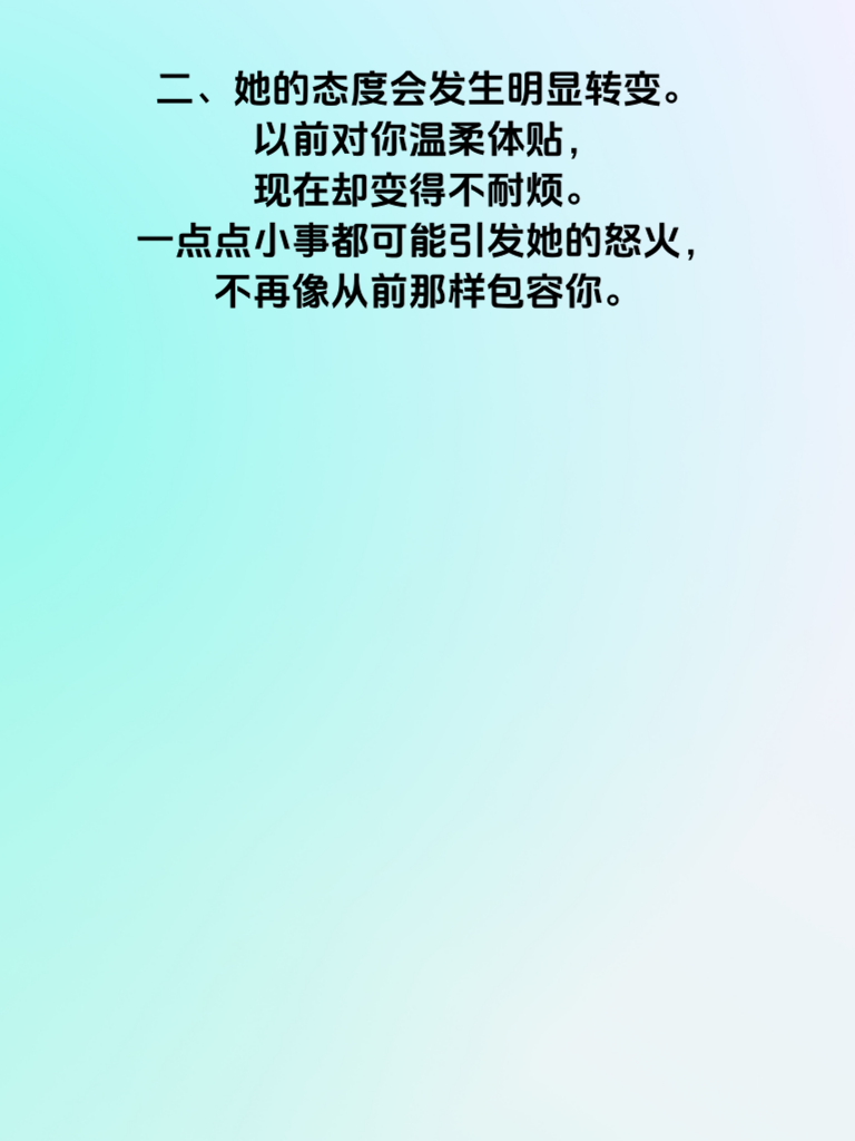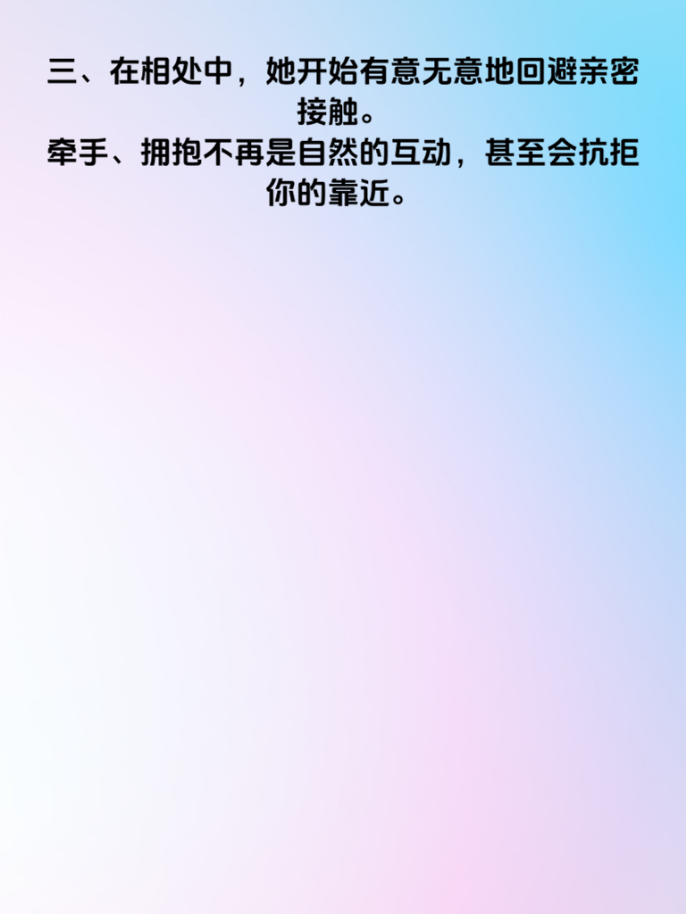 一、女生变心前,往往会开始减少与你的交流。曾经她会主动和你分享生活点滴,如今却变得沉默寡言。不再主动找话题,对你的回应也变得敷衍。 二、她的态度会发生明显转变。以前对你温柔体贴,现在却变得不耐烦。一点点小事都可能引发她的怒火,不再像从前那样包容你。 三、在相处中,她开始有意无意地回避亲密接触。牵手、拥抱不再是自然的互动,甚至会抗拒你的靠近。 四、她的生活重心似乎也发生了偏移。开始热衷于参加各种聚会、活动,而且不再邀请你一同前往,行踪变得神秘起来。 五、当你和她谈论未来时,她不再积极回应,眼神躲闪,态度模糊。不再像以前那样和你规划美好的蓝图,仿佛你们的未来与她无关。