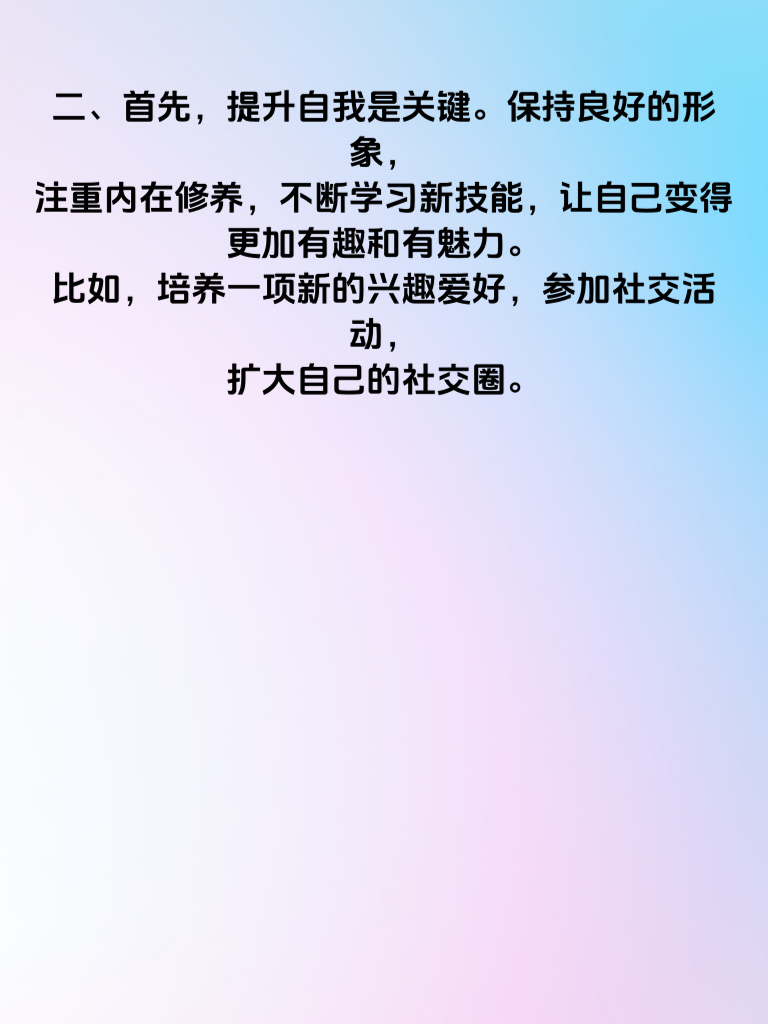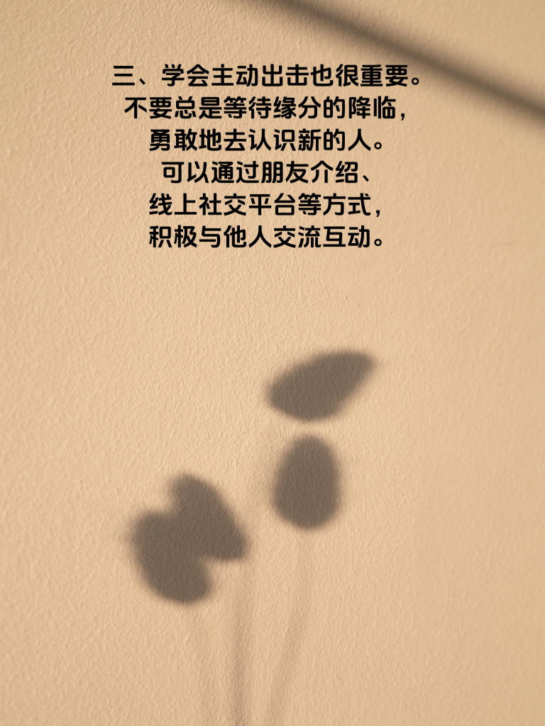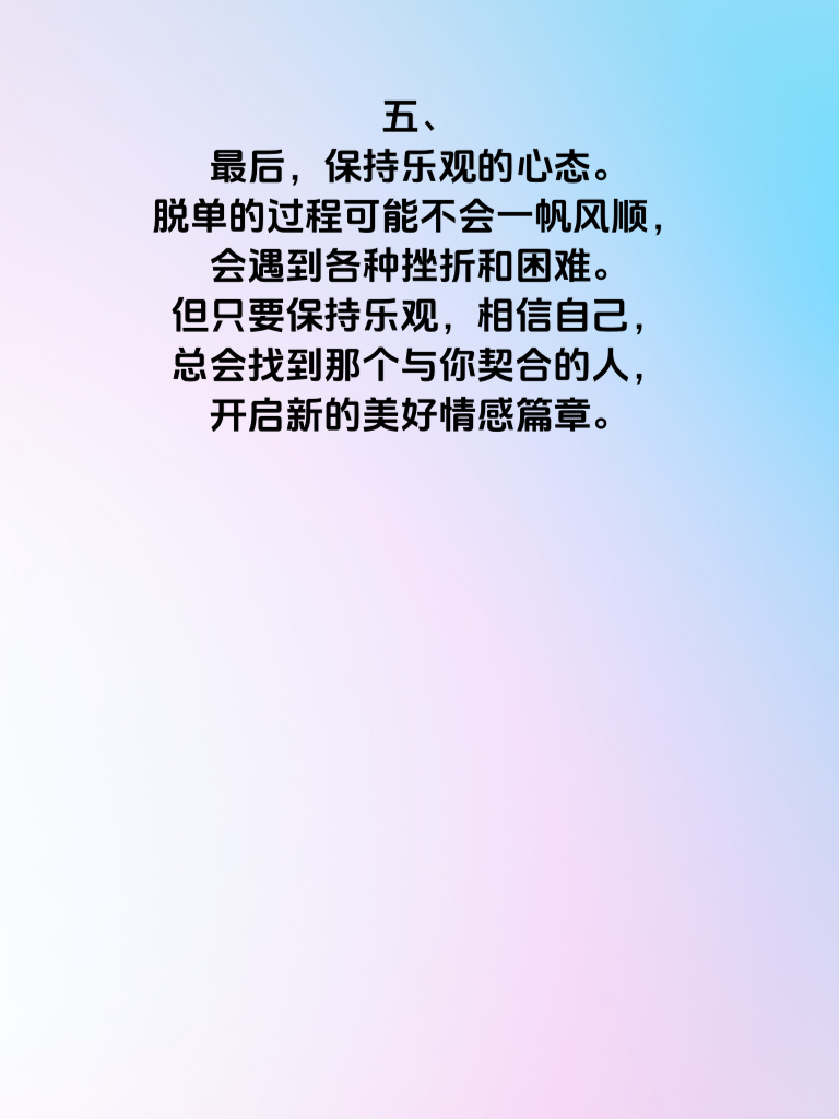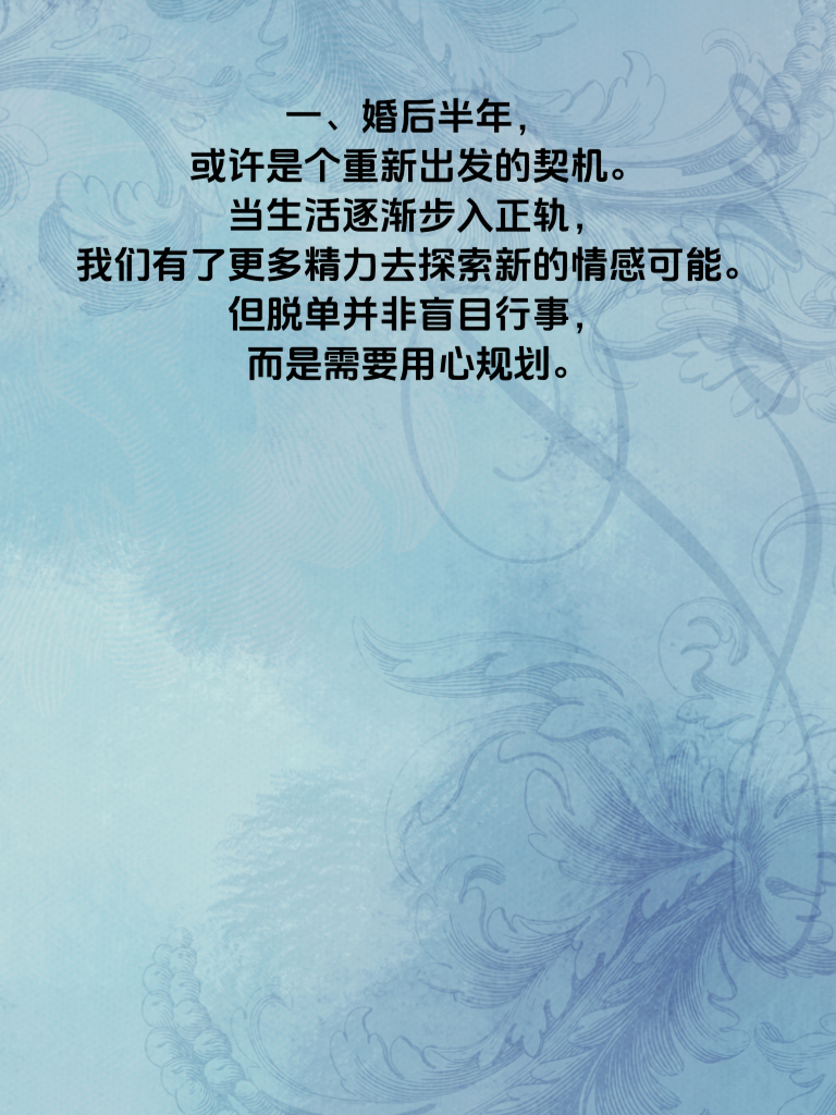 一、婚后半年,或许是个重新出发的契机。当生活逐渐步入正轨,我们有了更多精力去探索新的情感可能。但脱单并非盲目行事,而是需要用心规划。 二、首先,提升自我是关键。保持良好的形象,注重内在修养,不断学习新技能,让自己变得更加有趣和有魅力。比如,培养一项新的兴趣爱好,参加社交活动,扩大自己的社交圈。 三、学会主动出击也很重要。不要总是等待缘分的降临,勇敢地去认识新的人。可以通过朋友介绍、线上社交平台等方式,积极与他人交流互动。 四、真诚是打开对方心扉的钥匙。在与他人相处时,展现出真实的自己,不做作,不虚伪。用心倾听对方的想法和感受,给予关心和支持。 五、最后,保持乐观的心态。脱单的过程可能不会一帆风顺,会遇到各种挫折和困难。但只要保持乐观,相信自己,总会找到那个与你契合的人,开启新的美好情感篇章。