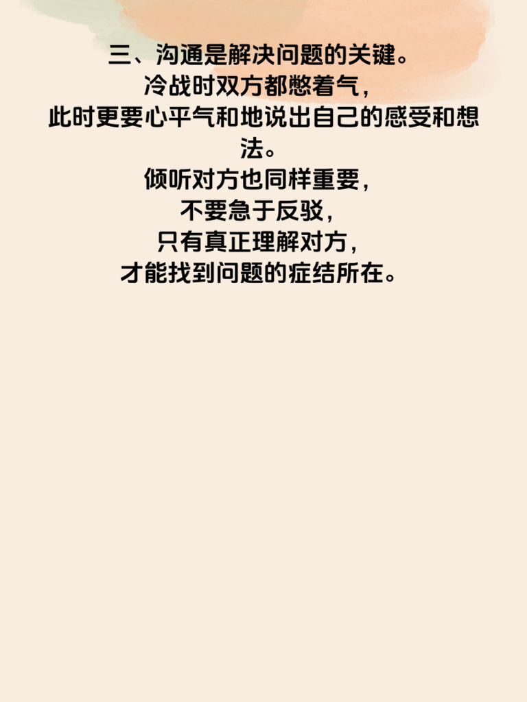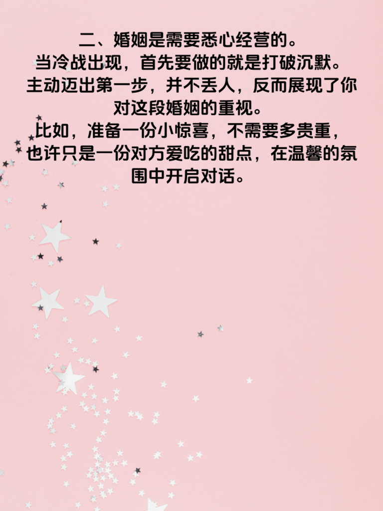 一、夫妻冷战两周,这看似不长的时间,却如暗流涌动,悄悄侵蚀着婚姻的根基。冷战期间,双方都紧闭心门,不愿沟通,这往往会让误解越来越深,矛盾越积越多。 二、婚姻是需要悉心经营的。当冷战出现,首先要做的就是打破沉默。主动迈出第一步,并不丢人,反而展现了你对这段婚姻的重视。比如,准备一份小惊喜,不需要多贵重,也许只是一份对方爱吃的甜点,在温馨的氛围中开启对话。 三、沟通是解决问题的关键。冷战时双方都憋着气,此时更要心平气和地说出自己的感受和想法。倾听对方也同样重要,不要急于反驳,只有真正理解对方,才能找到问题的症结所在。 四、如果任由冷战持续,婚姻很可能走向危机。所以,为了你们的爱情和家庭,别让冷战成为婚姻的杀手,及时化解矛盾,让温暖与爱重回你们的生活。
