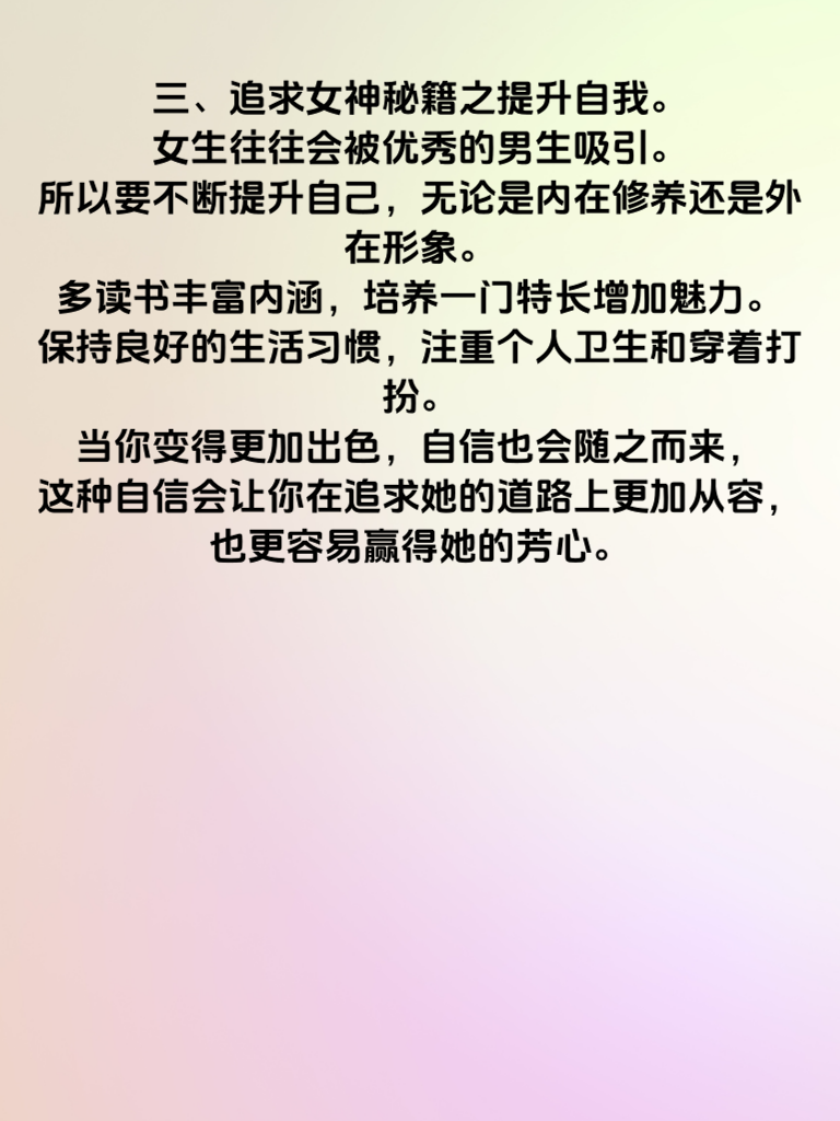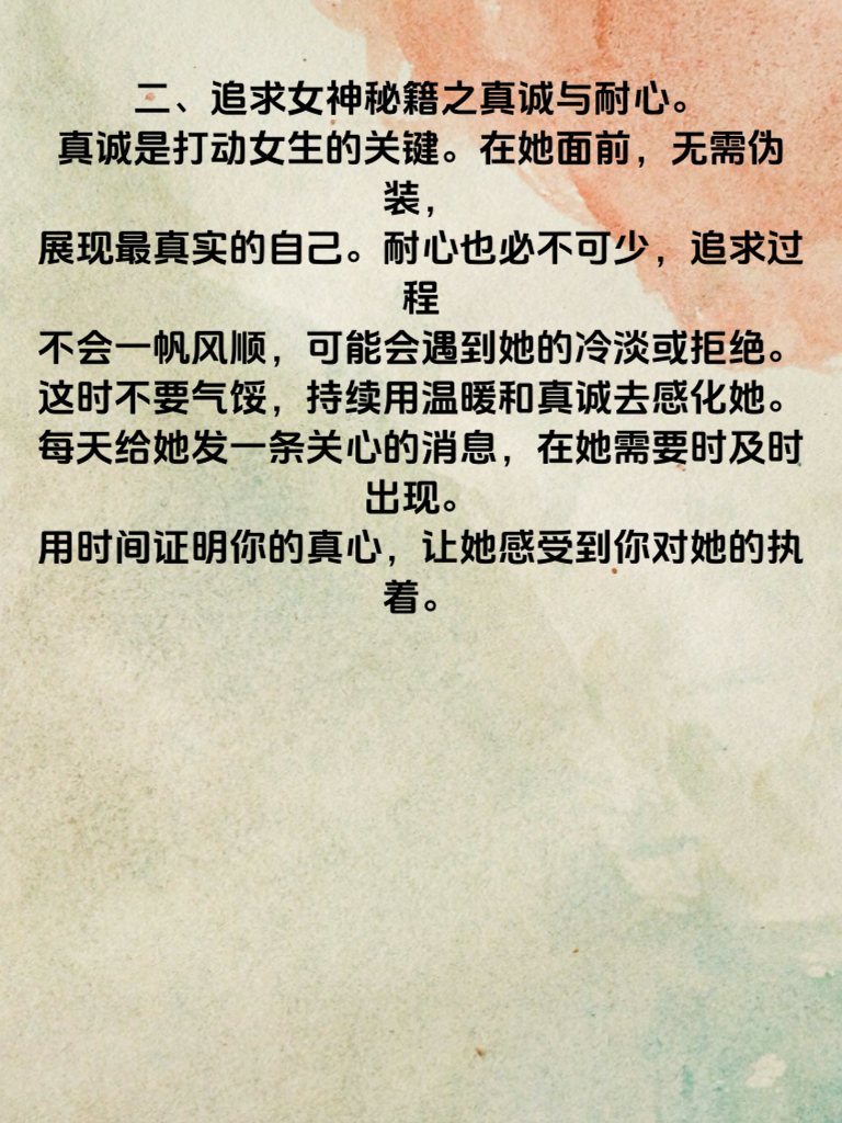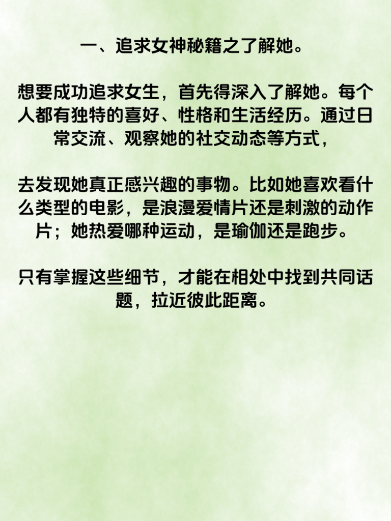 一、追求女神秘籍之了解她。想要成功追求女生,首先得深入了解她。每个人都有独特的喜好、性格和生活经历。通过日常交流、观察她的社交动态等方式,去发现她真正感兴趣的事物。比如她喜欢看什么类型的电影,是浪漫爱情片还是刺激的动作片;她热爱哪种运动,是瑜伽还是跑步。只有掌握这些细节,才能在相处中找到共同话题,拉近彼此距离。 二、追求女神秘籍之真诚与耐心。真诚是打动女生的关键。在她面前,无需伪装,展现最真实的自己。耐心也必不可少,追求过程不会一帆风顺,可能会遇到她的冷淡或拒绝。这时不要气馁,持续用温暖和真诚去感化她。每天给她发一条关心的消息,在她需要时及时出现。用时间证明你的真心,让她感受到你对她的执着。 三、追求女神秘籍之提升自我。女生往往会被优秀的男生吸引。所以要不断提升自己,无论是内在修养还是外在形象。多读书丰富内涵,培养一门特长增加魅力。保持良好的生活习惯,注重个人卫生和穿着打扮。当你变得更加出色,自信也会随之而来,这种自信会让你在追求她的道路上更加从容,也更容易赢得她的芳心。