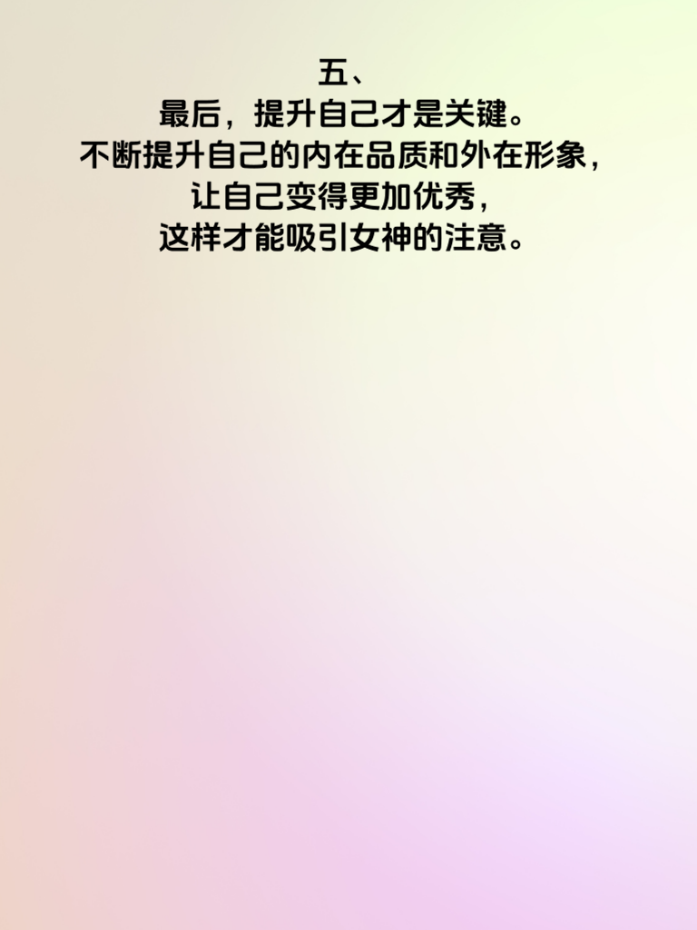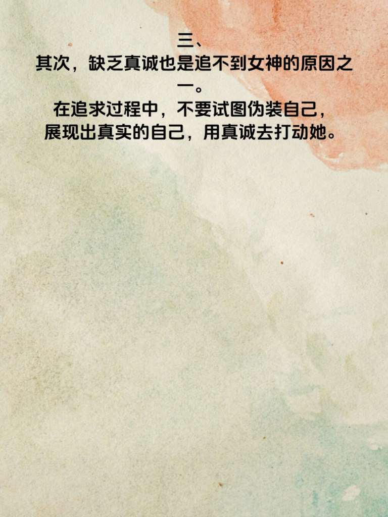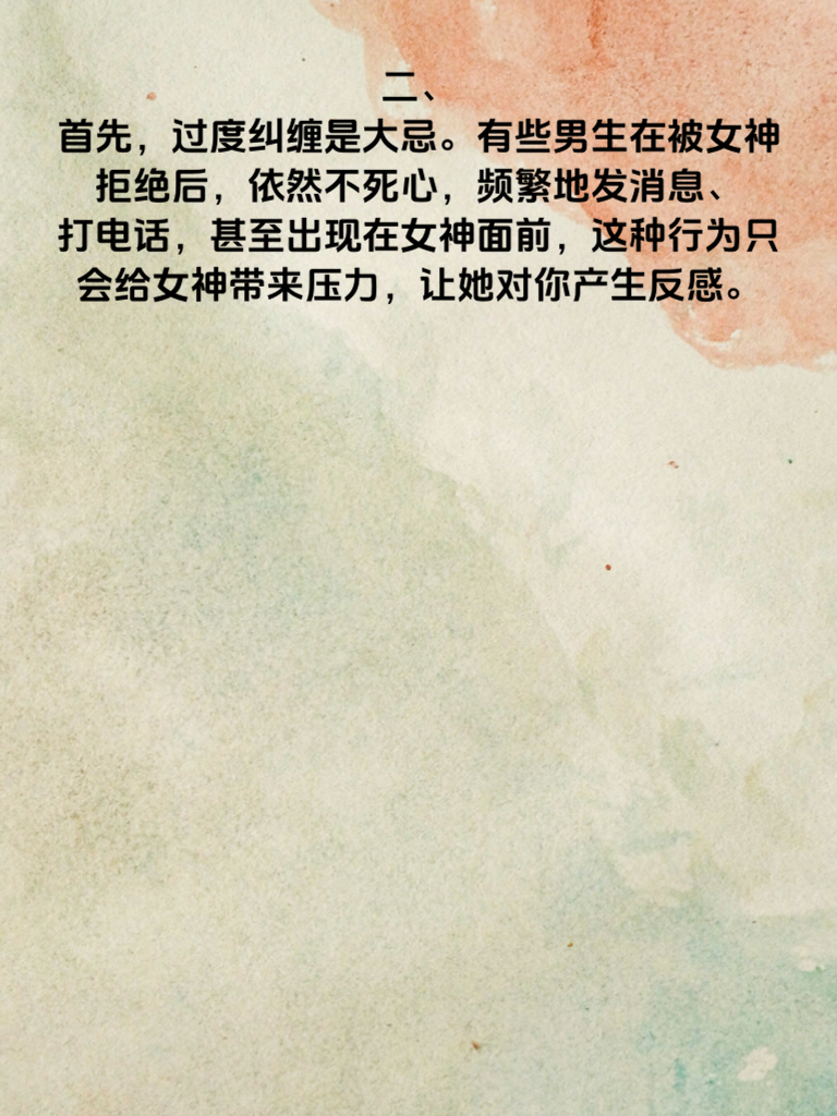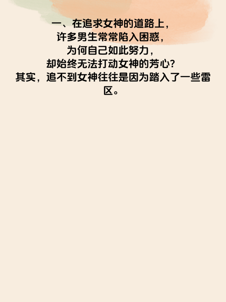 一、在追求女神的道路上,许多男生常常陷入困惑,为何自己如此努力,却始终无法打动女神的芳心?其实,追不到女神往往是因为踏入了一些雷区。 二、首先,过度纠缠是大忌。有些男生在被女神拒绝后,依然不死心,频繁地发消息、打电话,甚至出现在女神面前,这种行为只会给女神带来压力,让她对你产生反感。 三、其次,缺乏真诚也是追不到女神的原因之一。在追求过程中,不要试图伪装自己,展现出真实的自己,用真诚去打动她。 四、再者,没有尊重女神的想法和感受也不行。每个人都有自己的想法和选择,要尊重女神的决定,不要强迫她做不愿意做的事情。 五、最后,提升自己才是关键。不断提升自己的内在品质和外在形象,让自己变得更加优秀,这样才能吸引女神的注意。