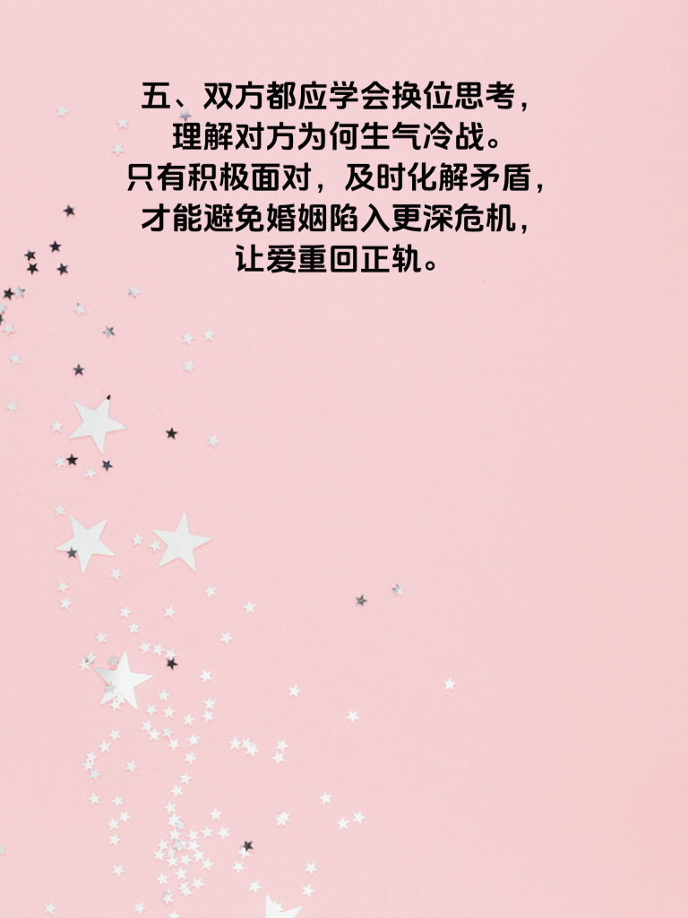 一、婚姻中,冷战是一场无声的战争,而当冷战超过5天,那重重隐患便如乌云般笼罩。这不仅会让彼此的心越离越远,更可能成为婚姻破裂的导火索。 二、冷战初期,或许只是小小的分歧,但超过5天,情绪会不断累积。双方都憋着气,不愿先低头,可内心的委屈、愤怒却在持续发酵。 三、长期冷战会让沟通渠道堵塞,两人不再分享生活点滴,情感交流断层。渐渐地,曾经熟悉亲密的爱人变得陌生。 四、想要打破这僵局,一方要勇敢迈出第一步,可以写封信,真诚表达自己的感受与想法;或者精心准备一份小礼物,缓和气氛。 五、双方都应学会换位思考,理解对方为何生气冷战。只有积极面对,及时化解矛盾,才能避免婚姻陷入更深危机,让爱重回正轨。