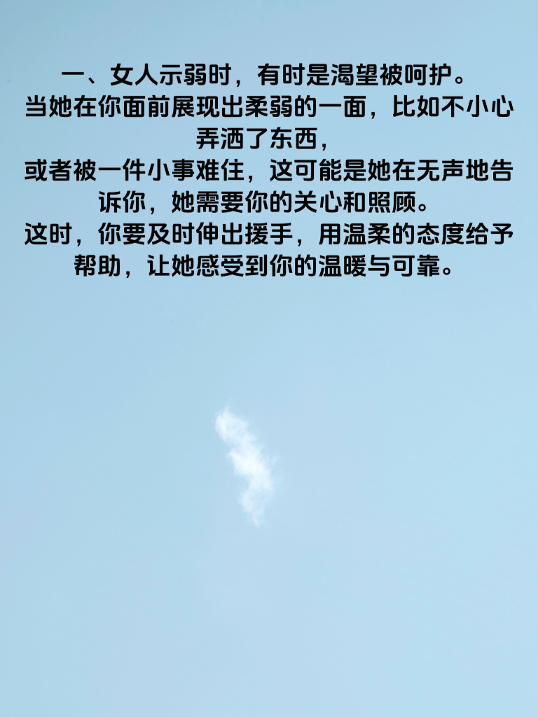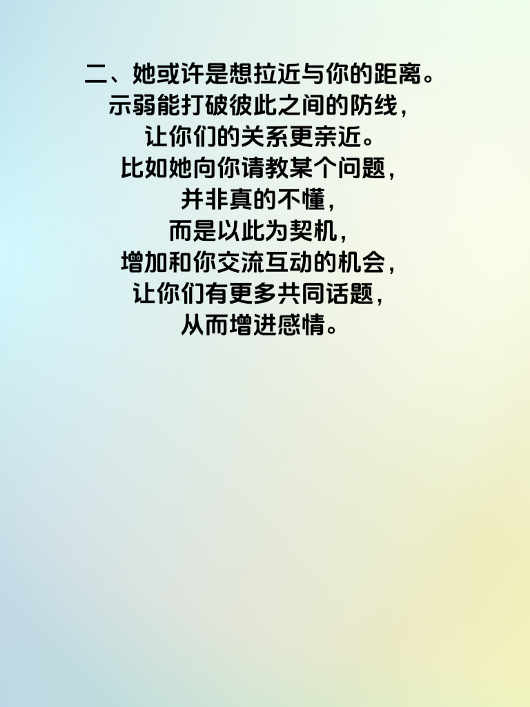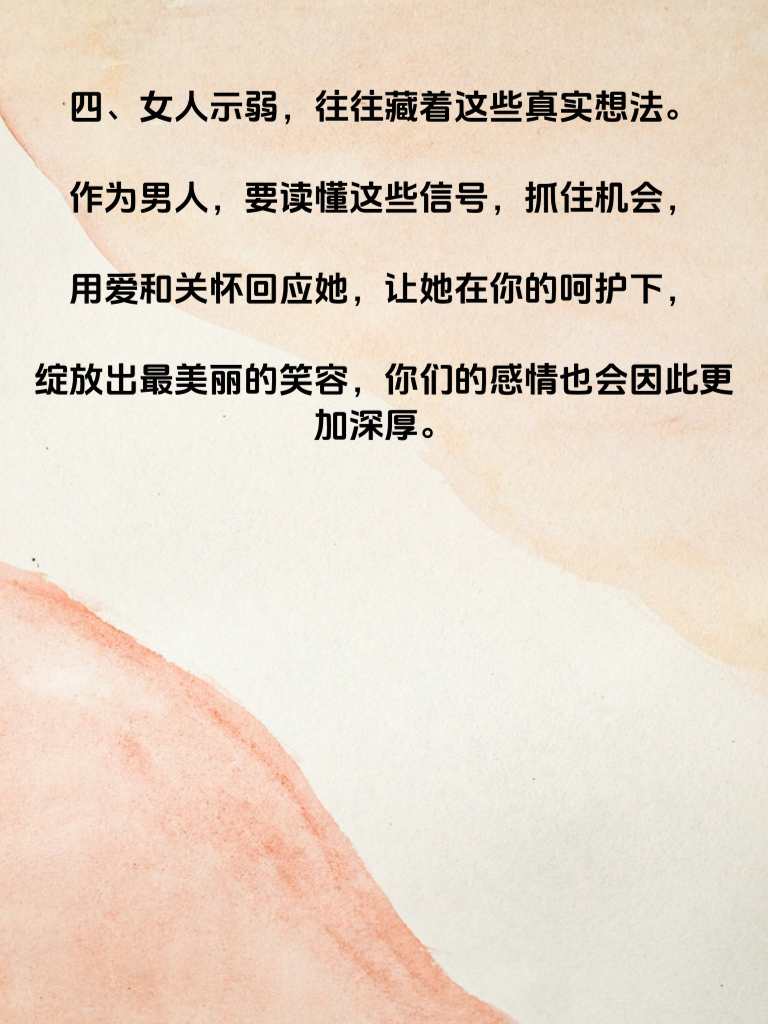 一、女人示弱时,有时是渴望被呵护。当她在你面前展现出柔弱的一面,比如不小心弄洒了东西,或者被一件小事难住,这可能是她在无声地告诉你,她需要你的关心和照顾。这时,你要及时伸出援手,用温柔的态度给予帮助,让她感受到你的温暖与可靠。 二、她或许是想拉近与你的距离。示弱能打破彼此之间的防线,让你们的关系更亲近。比如她向你请教某个问题,并非真的不懂,而是以此为契机,增加和你交流互动的机会,让你们有更多共同话题,从而增进感情。 三、还有可能是在试探你的态度。她通过示弱来观察你对她的耐心和包容程度。若你能耐心回应,她会觉得你值得信赖;反之,若你表现不耐烦,她可能会重新审视你们的关系。所以,面对她的示弱,一定要保持耐心,展现出你的体贴。 四、女人示弱,往往藏着这些真实想法。作为男人,要读懂这些信号,抓住机会,用爱和关怀回应她,让她在你的呵护下绽放出最美丽的笑容,你们的感情也会因此更加深厚。