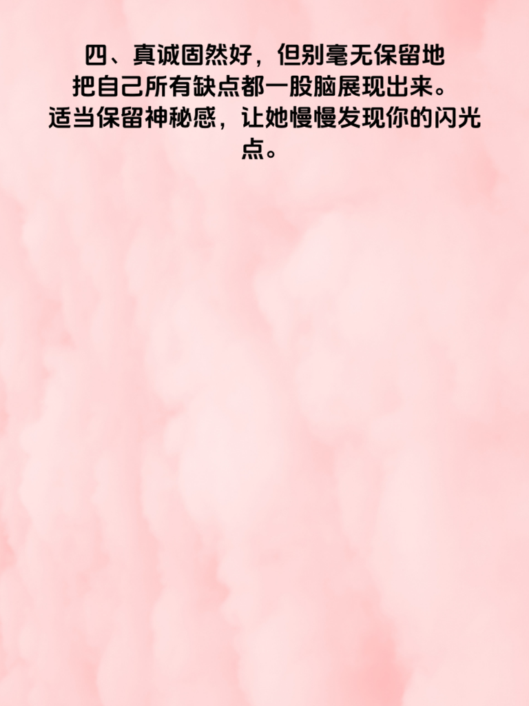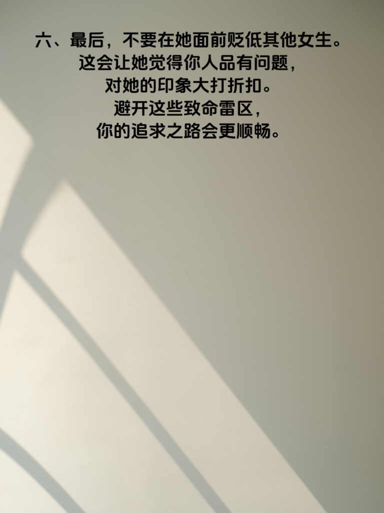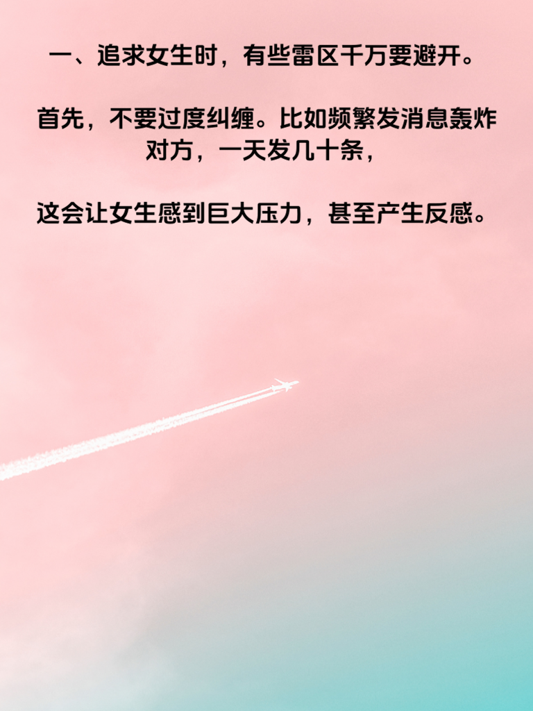 一、追求女生时,有些雷区千万要避开。首先,不要过度纠缠。比如频繁发消息轰炸对方,一天发几十条,这会让女生感到巨大压力,甚至产生反感。 二、尊重女生的个人空间也至关重要。每个人都需要属于自己的时间去做喜欢的事,不要时刻要求她报备行踪,给她足够的自由。 三、还有,别过早暴露需求感。刚认识就急着表白或者明示自己想和她在一起,会让女生觉得你目的性太强,吓跑她。 四、真诚固然好,但别毫无保留地把自己所有缺点都一股脑展现出来。适当保留神秘感,让她慢慢发现你的闪光点。 五、另外,聊天时不要总是自说自话。多倾听她的想法和感受,给予她充分表达的机会,这样才能增进彼此的了解。 六、最后,不要在她面前贬低其他女生。这会让她觉得你人品有问题,对她的印象大打折扣。避开这些致命雷区,你的追求之路会更顺畅。