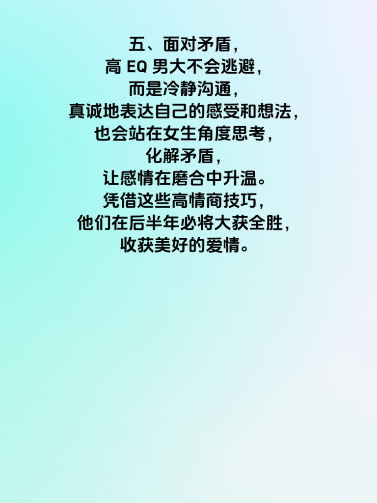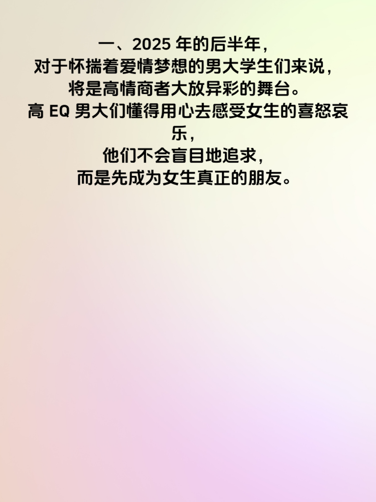 一、2025 年的后半年,对于怀揣着爱情梦想的男大学生们来说,将是高情商者大放异彩的舞台。高 EQ 男大们懂得用心去感受女生的喜怒哀乐,他们不会盲目地追求,而是先成为女生真正的朋友。 二、他们善于倾听,在女生倾诉烦恼时,耐心给予安慰和建议,用温暖的话语走进女生的内心。比如在聊天中,能敏锐捕捉女生话语中的情绪,给予恰到好处的回应。 三、高 EQ 男大明白尊重的重要性,尊重女生的想法、选择和喜好。不会强行将自己的观点加于女生身上,而是支持她去做自己喜欢的事。 四、在相处中,他们会制造一些小惊喜,不是昂贵的礼物,而是用心准备的一份早餐、一张手写的卡片。这些细节满满都是爱意,让女生感受到特别。 五、面对矛盾,高 EQ 男大不会逃避,而是冷静沟通,真诚地表达自己的感受和想法,也会站在女生角度思考,化解矛盾,让感情在磨合中升温。凭借这些高情商技巧,他们在后半年必将大获全胜,收获美好的爱情。
