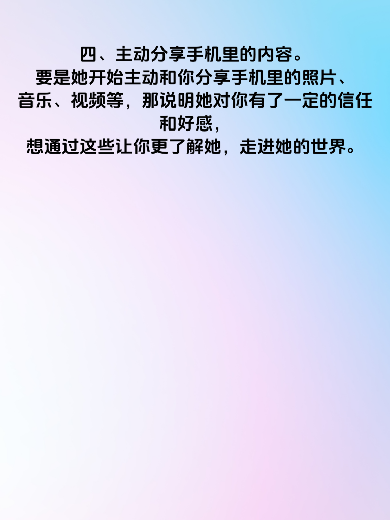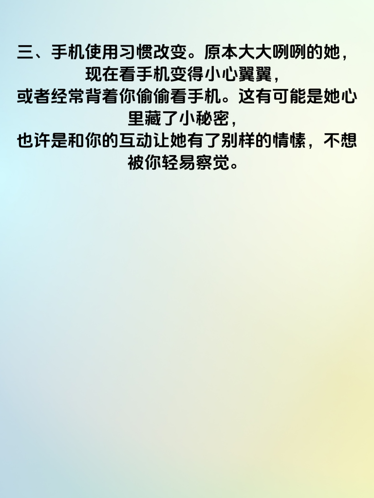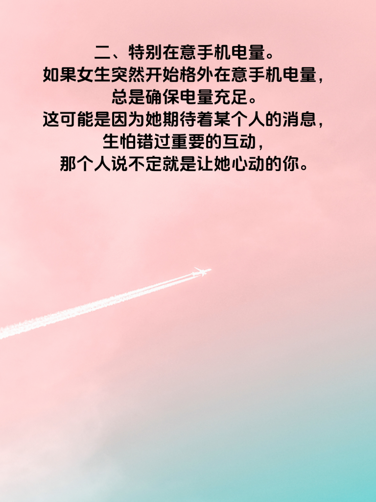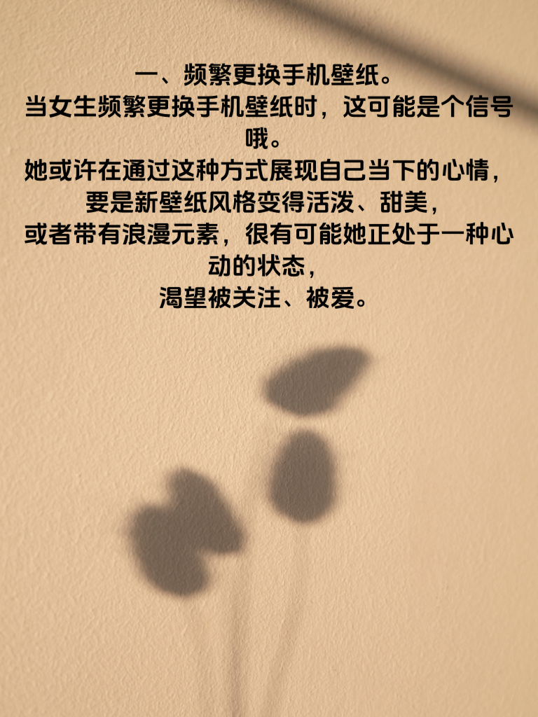 一、频繁更换手机壁纸。当女生频繁更换手机壁纸时,这可能是个信号哦。她或许在通过这种方式展现自己当下的心情,要是新壁纸风格变得活泼、甜美,或者带有浪漫元素,很有可能她正处于一种心动的状态,渴望被关注、被爱。 二、特别在意手机电量。如果女生突然开始格外在意手机电量,总是确保电量充足。这可能是因为她期待着某个人的消息,生怕错过重要的互动,那个人说不定就是让她心动的你。 三、手机使用习惯改变。原本大大咧咧的她,现在看手机变得小心翼翼,或者经常背着你偷偷看手机。这有可能是她心里藏了小秘密,也许是和你的互动让她有了别样的情愫,不想被你轻易察觉。 四、主动分享手机里的内容。要是她开始主动和你分享手机里的照片、音乐、视频等,那说明她对你有了一定的信任和好感,想通过这些让你更了解她,走进她的世界。
