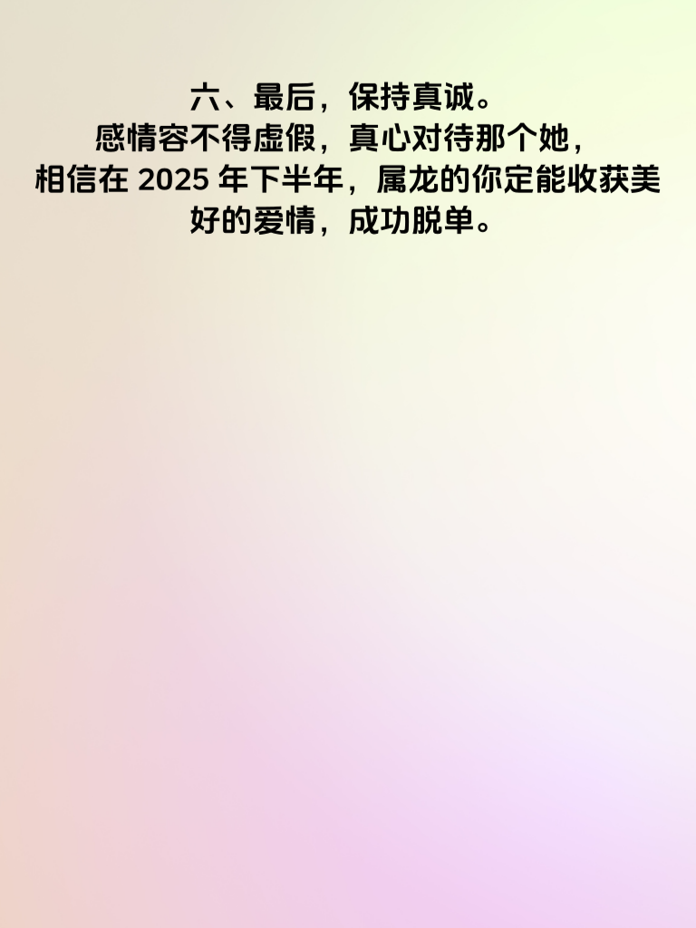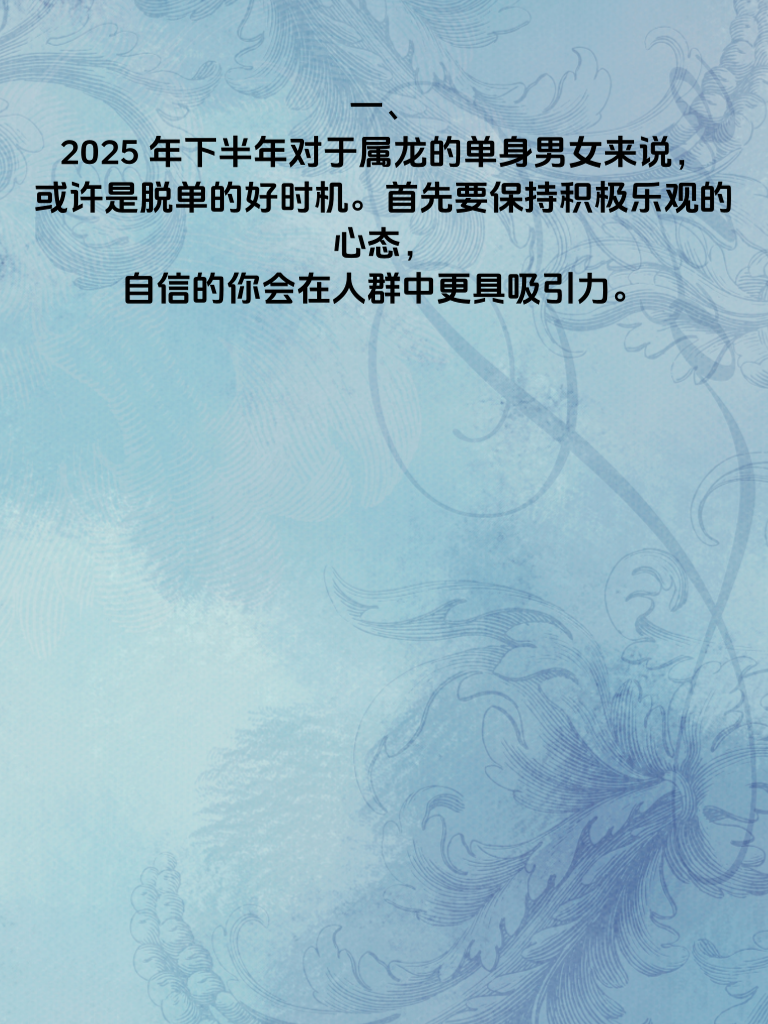 一、2025 年下半年对于属龙的单身男女来说,或许是脱单的好时机。首先要保持积极乐观的心态,自信的你会在人群中更具吸引力。 二、拓展社交圈子是关键。参加各类兴趣活动,无论是运动、艺术还是读书俱乐部,都可能让你邂逅那个特别的她。在活动中真诚交流,展现你的魅力与才华。 三、注重自身形象管理。干净整洁的外表,得体的穿着打扮,会给女生留下良好的第一印象。属龙的你本就有着独特的气质,再加以修饰,定会更出众。 四、学会倾听女生的想法。在交流中,耐心倾听她的观点和感受,让她感受到被尊重和理解。适时给予回应和关心,增进彼此的了解。 五、制造一些浪漫的小惊喜。不需要太过奢华,一束鲜花、一份亲手制作的小点心,都能温暖她的心。用这些细节传递你的爱意。 六、最后,保持真诚。感情容不得虚假,真心对待那个她,相信在 2025 年下半年,属龙的你定能收获美好的爱情,成功脱单。
