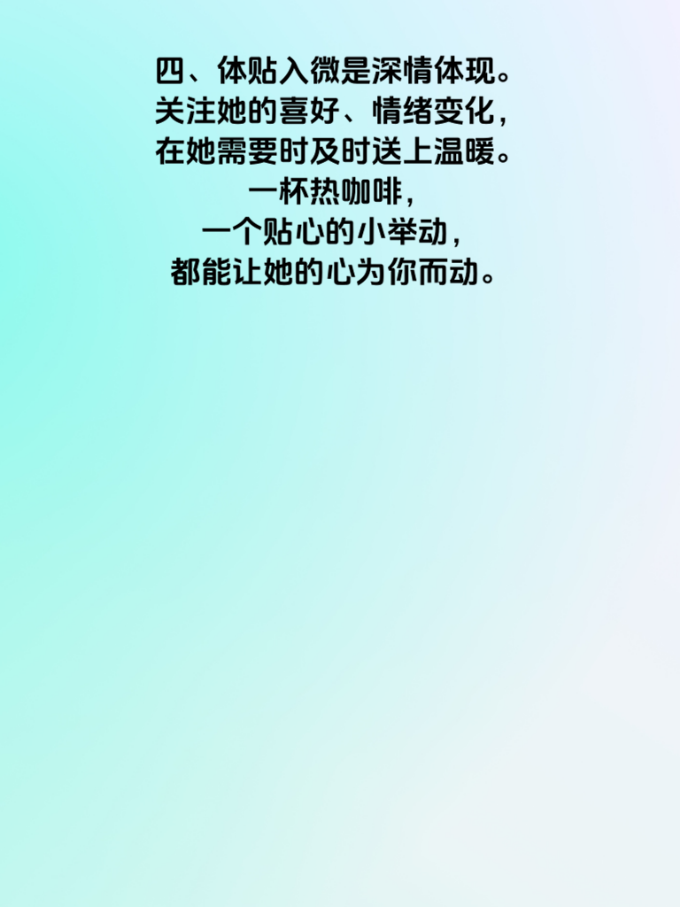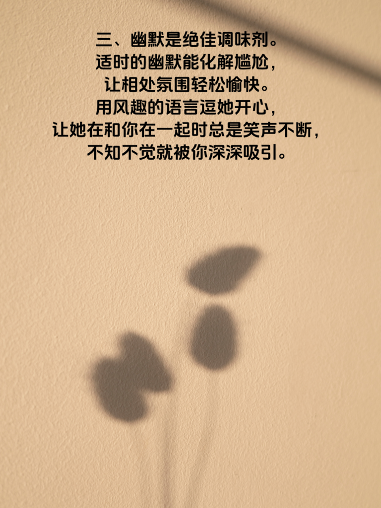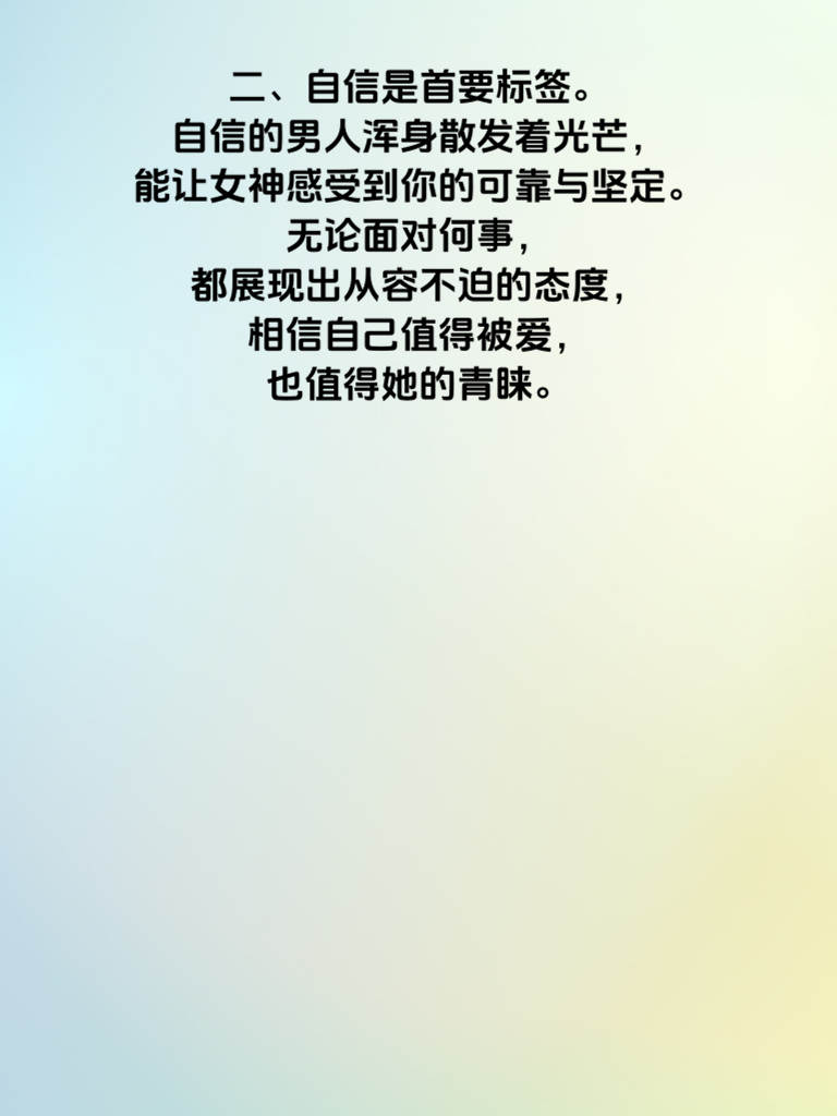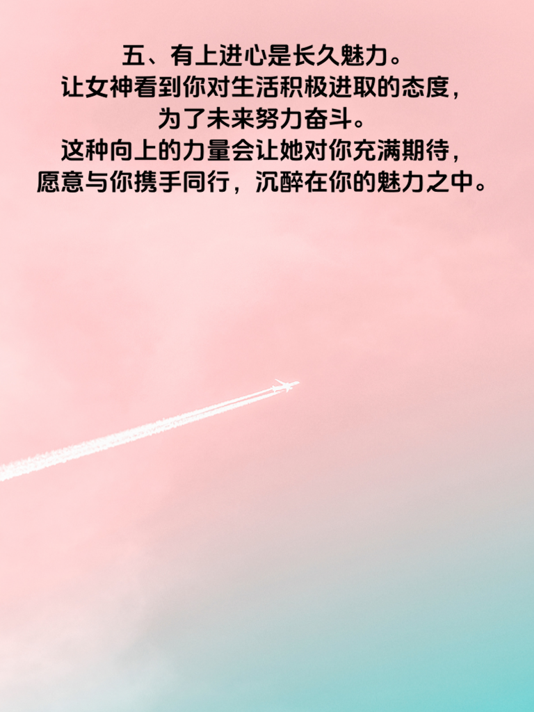 一、追求女神,魅力标签是关键。想要让她醉心于你,这5个魅力标签必不可少。 二、自信是首要标签。自信的男人浑身散发着光芒,能让女神感受到你的可靠与坚定。无论面对何事,都展现出从容不迫的态度,相信自己值得被爱,也值得她的青睐。 三、幽默是绝佳调味剂。适时的幽默能化解尴尬,让相处氛围轻松愉快。用风趣的语言逗她开心,让她在和你在一起时总是笑声不断,不知不觉就被你深深吸引。 四、体贴入微是深情体现。关注她的喜好、情绪变化,在她需要时及时送上温暖。一杯热咖啡,一个贴心的小举动,都能让她的心为你而动。 五、有上进心是长久魅力。让女神看到你对生活积极进取的态度,为了未来努力奋斗。这种向上的力量会让她对你充满期待,愿意与你携手同行,沉醉在你的魅力之中。