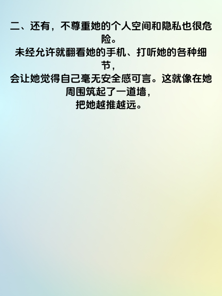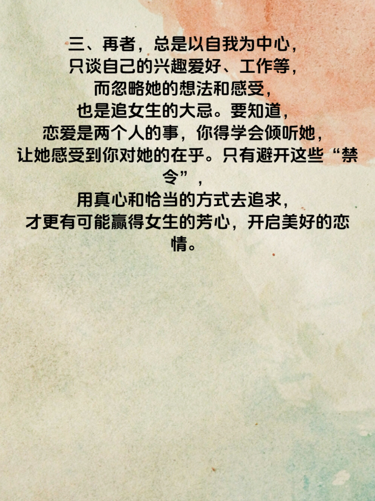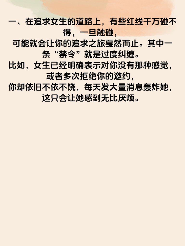 一、在追求女生的道路上,有些红线千万碰不得,一旦触碰,可能就会让你的追求之旅戛然而止。其中一条“禁令”就是过度纠缠。比如,女生已经明确表示对你没有那种感觉,或者多次拒绝你的邀约,你却依旧不依不饶,每天发大量消息轰炸她,这只会让她感到无比厌烦。 二、还有,不尊重她的个人空间和隐私也很危险。未经允许就翻看她的手机、打听她的各种细节,会让她觉得自己毫无安全感可言。这就像在她周围筑起了一道墙,把她越推越远。 三、再者,总是以自我为中心,只谈自己的兴趣爱好、工作等,而忽略她的想法和感受,也是追女生的大忌。要知道,恋爱是两个人的事,你得学会倾听她,让她感受到你对她的在乎。只有避开这些“禁令”,用真心和恰当的方式去追求,才更有可能赢得女生的芳心,开启美好的恋情。
