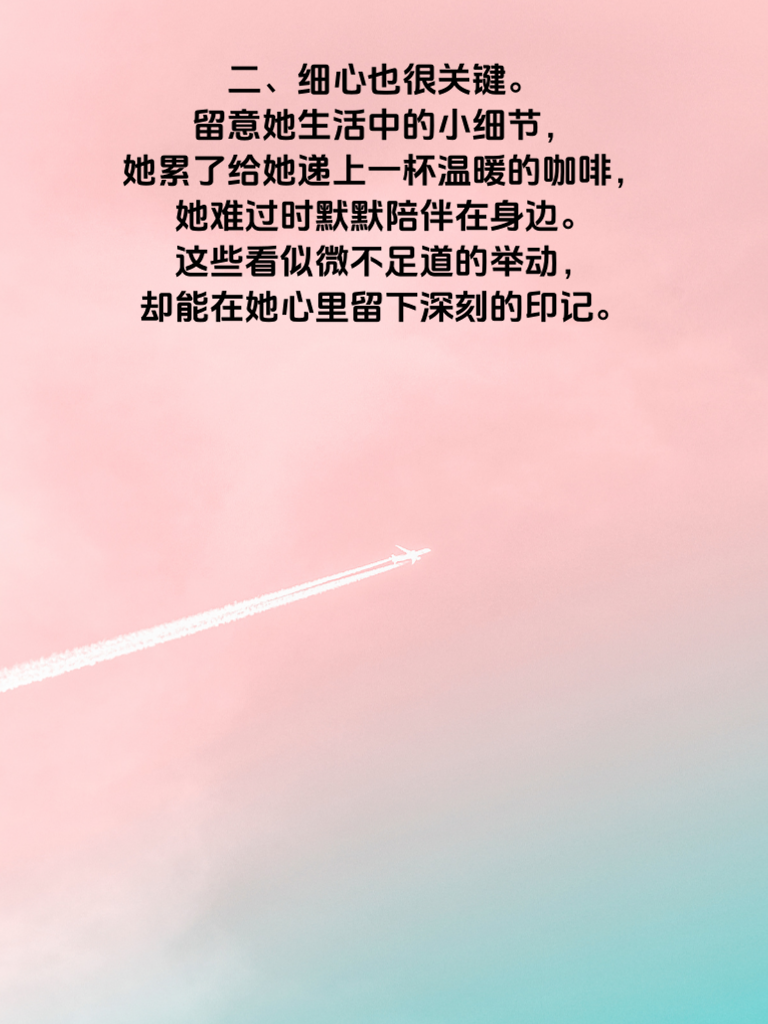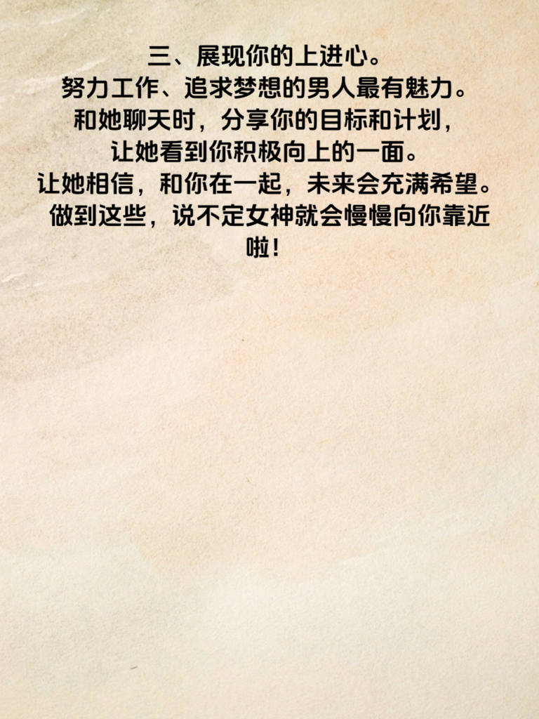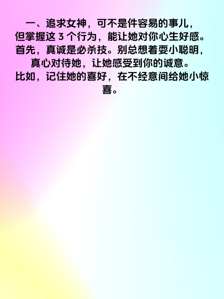 一、追求女神,可不是件容易的事儿,但掌握这3个行为,能让她对你心生好感。首先,真诚是必杀技。别总想着耍小聪明,真心对待她,让她感受到你的诚意。比如,记住她的喜好,在不经意间给她小惊喜。 二、细心也很关键。留意她生活中的小细节,她累了给她递上一杯温暖的咖啡,她难过时默默陪伴在身边。这些看似微不足道的举动,却能在她心里留下深刻的印记。 三、展现你的上进心。努力工作、追求梦想的男人最有魅力。和她聊天时,分享你的目标和计划,让她看到你积极向上的一面。让她相信,和你在一起,未来会充满希望。做到这些,说不定女神就会慢慢向你靠近啦!