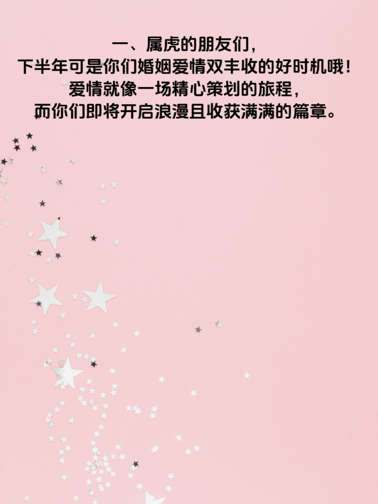 一、属虎的朋友们,下半年可是你们婚姻爱情双丰收的好时机哦!爱情就像一场精心策划的旅程,而你们即将开启浪漫且收获满满的篇章。 二、在追求爱情的道路上,要保持自信大方。属虎的你们本就有着独特的魅力,下半年更要尽情展现。主动去结识心仪的对象,真诚地交流,让对方看到你热情且真诚的心。 三、对于婚姻而言,耐心和理解是关键。在与伴侣相处时,多倾听对方的想法,包容彼此的小缺点。遇到分歧时,心平气和地沟通,共同寻找解决办法。 四、下半年,不妨多制造一些浪漫的回忆。一起去看一场午夜场电影,漫步在月光下的海边,这些温馨的时刻会让你们的感情更加深厚。相信属虎的你们,在下半年定能收获美好的婚姻与甜蜜的爱情,让幸福时刻围绕。