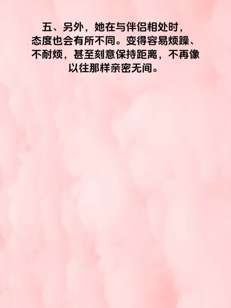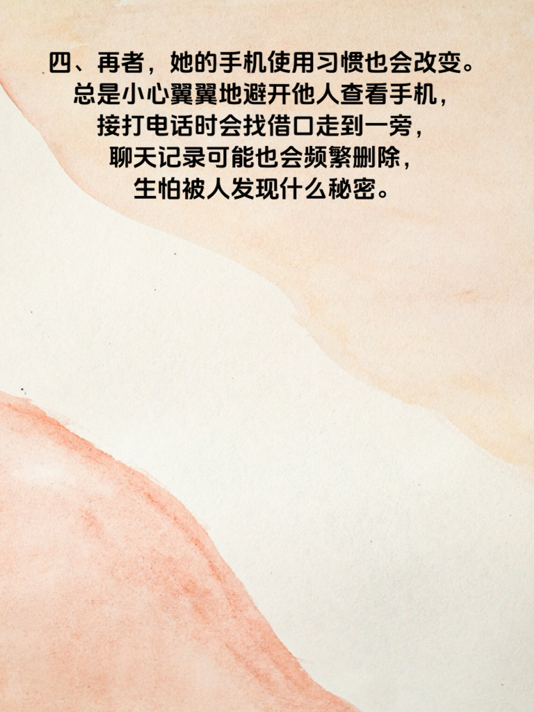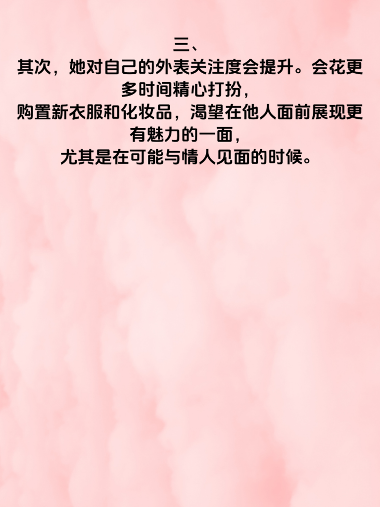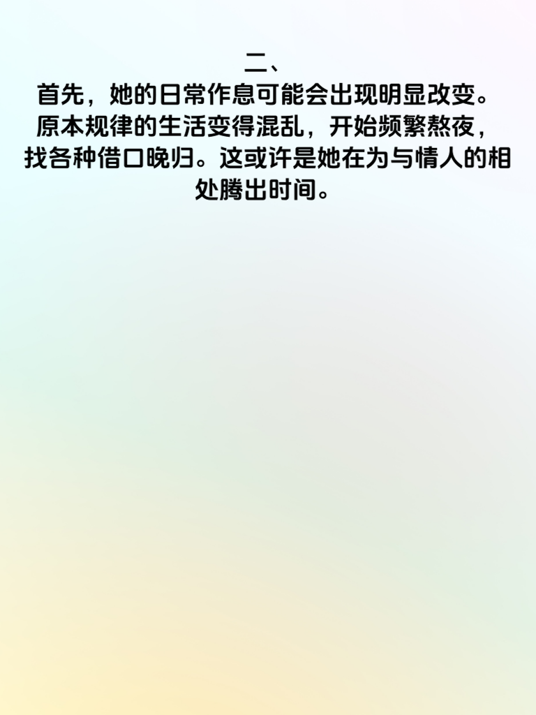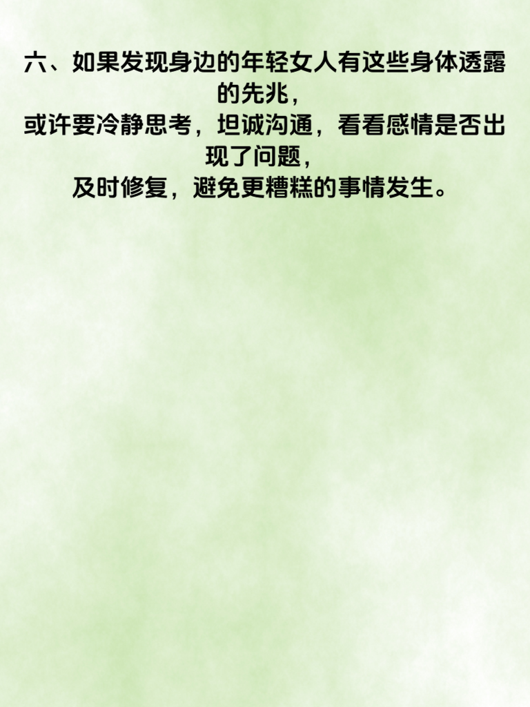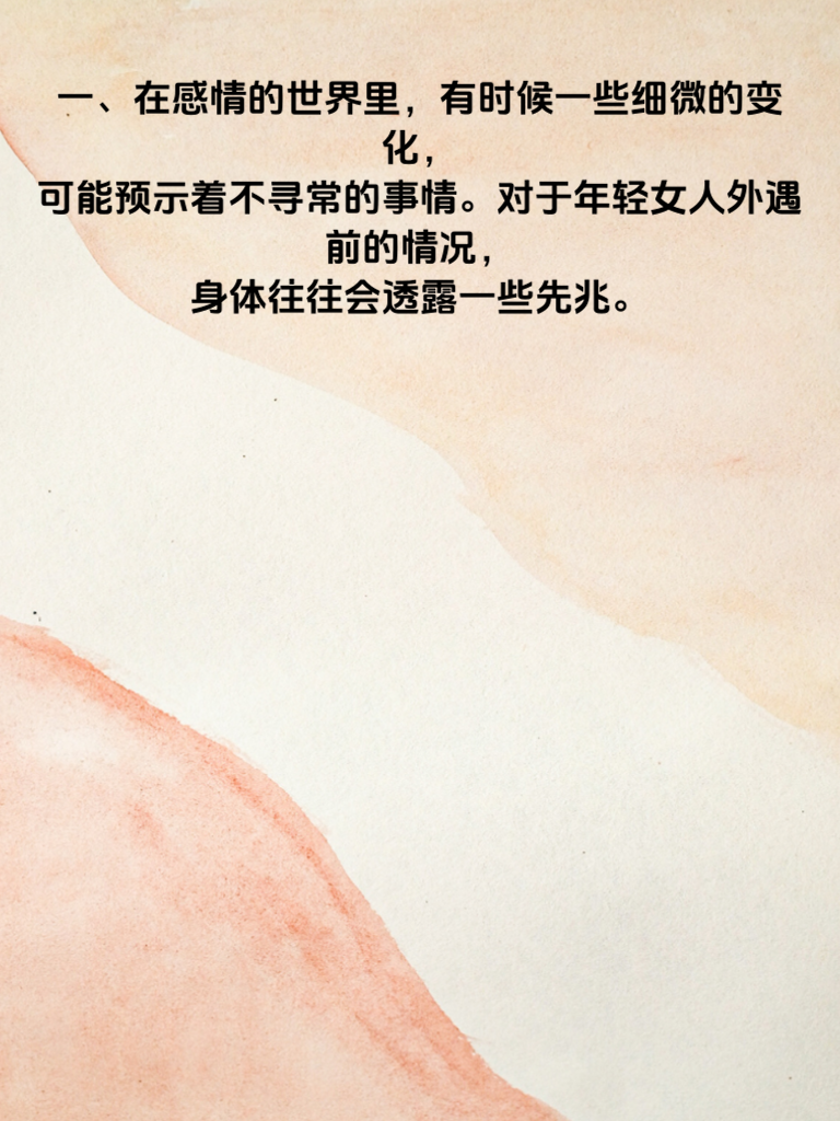 一、在感情的世界里,有时候一些细微的变化可能预示着不寻常的事情。对于年轻女人外遇前的情况,身体往往会透露一些先兆。 二、首先,她的日常作息可能会出现明显改变。原本规律的生活变得混乱,开始频繁熬夜,找各种借口晚归。这或许是她在为与情人的相处腾出时间。 三、其次,她对自己的外表关注度会提升。会花更多时间精心打扮,购置新衣服和化妆品,渴望在他人面前展现更有魅力的一面,尤其是在可能与情人见面的时候。 四、再者,她的手机使用习惯也会改变。总是小心翼翼地避开他人查看手机,接打电话时会找借口走到一旁,聊天记录可能也会频繁删除,生怕被人发现什么秘密。 五、另外,她在与伴侣相处时,态度也会有所不同。变得容易烦躁、不耐烦,甚至刻意保持距离,不再像以往那样亲密无间。 六、如果发现身边的年轻女人有这些身体透露的先兆,或许要冷静思考,坦诚沟通,看看感情是否出现了问题,及时修复,避免更糟糕的事情发生。