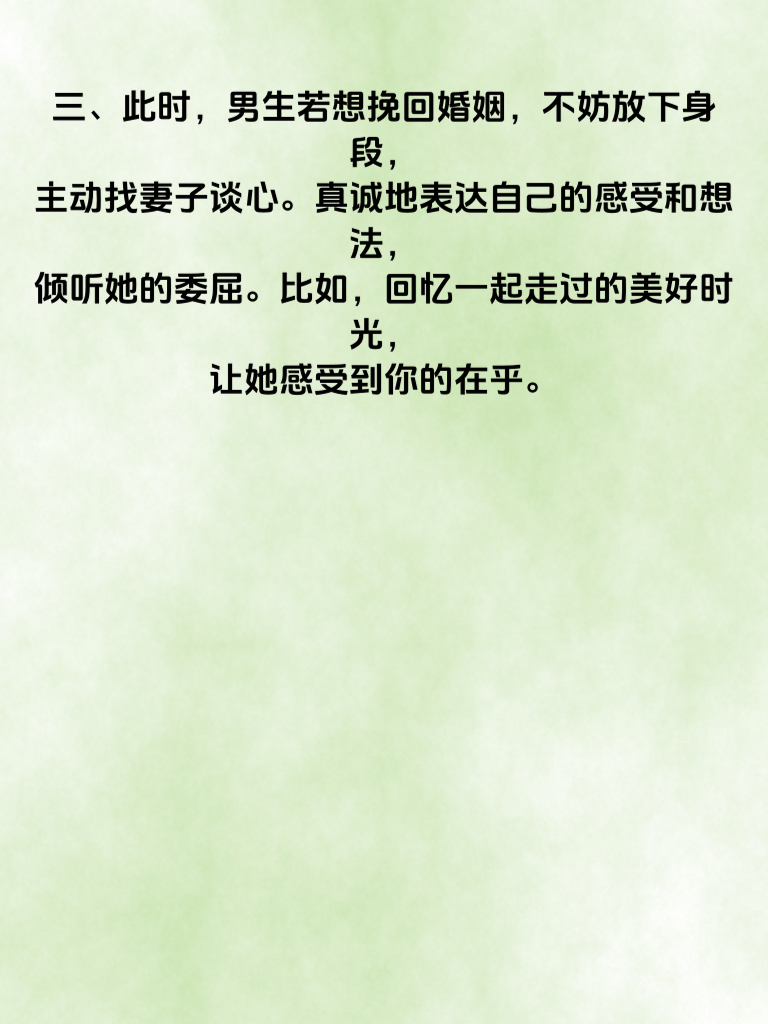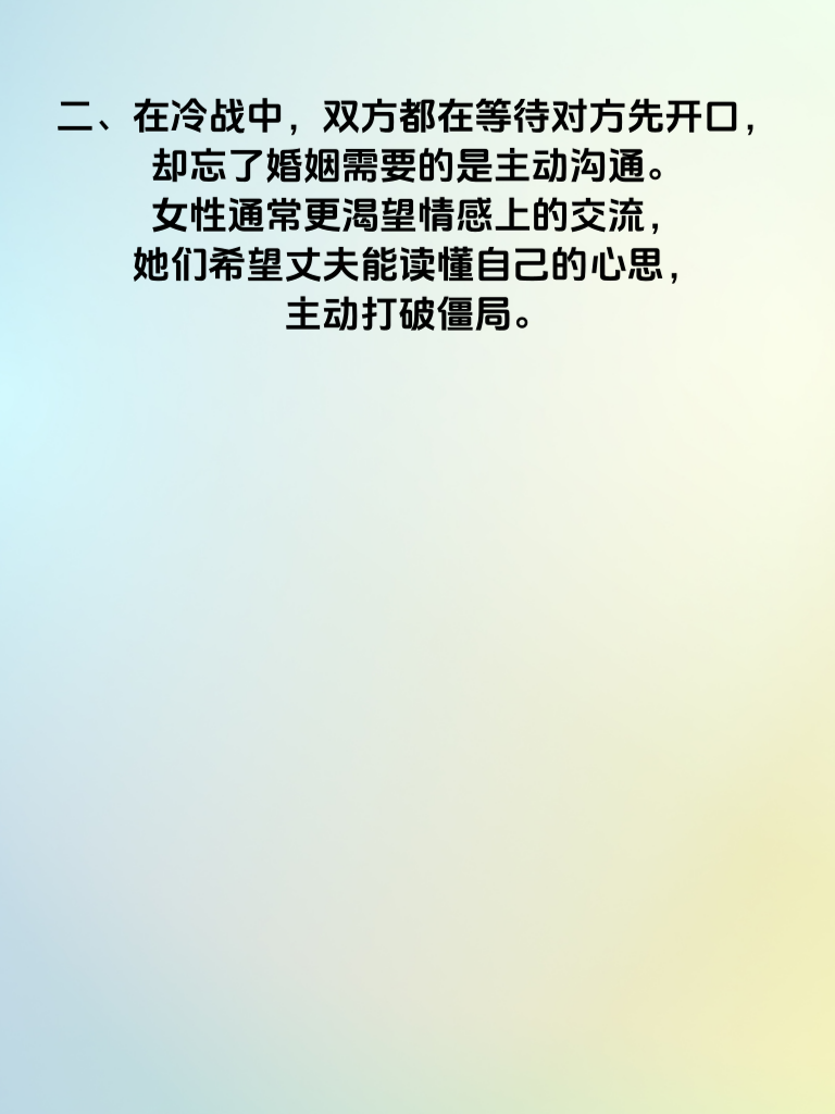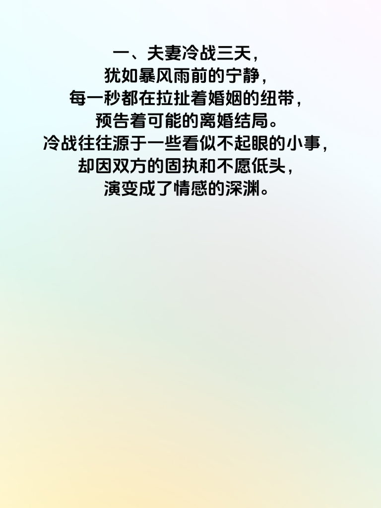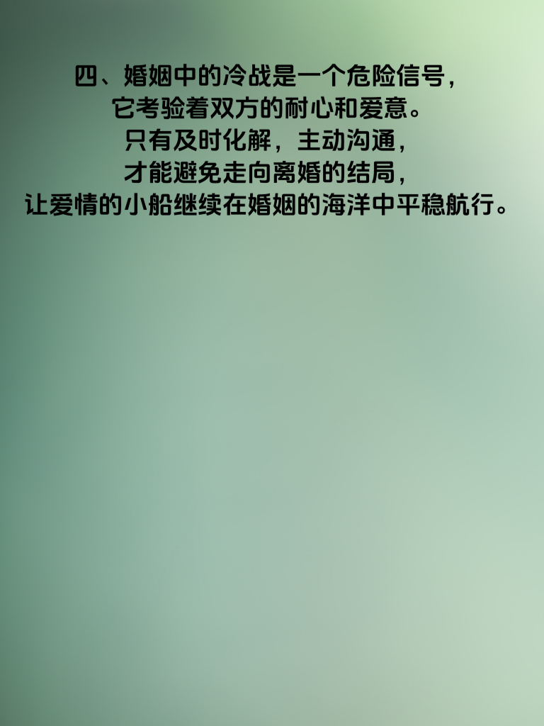 一、夫妻冷战三天,犹如暴风雨前的宁静,每一秒都在拉扯着婚姻的纽带,预告着可能的离婚结局。冷战往往源于一些看似不起眼的小事,却因双方的固执和不愿低头,演变成了情感的深渊。 二、在冷战中,双方都在等待对方先开口,却忘了婚姻需要的是主动沟通。女性通常更渴望情感上的交流,她们希望丈夫能读懂自己的心思,主动打破僵局。 三、此时,男生若想挽回婚姻,不妨放下身段,主动找妻子谈心。真诚地表达自己的感受和想法,倾听她的委屈。比如,回忆一起走过的美好时光,让她感受到你的在乎。 四、婚姻中的冷战是一个危险信号,它考验着双方的耐心和爱意。只有及时化解,主动沟通,才能避免走向离婚的结局,让爱情的小船继续在婚姻的海洋中平稳航行。