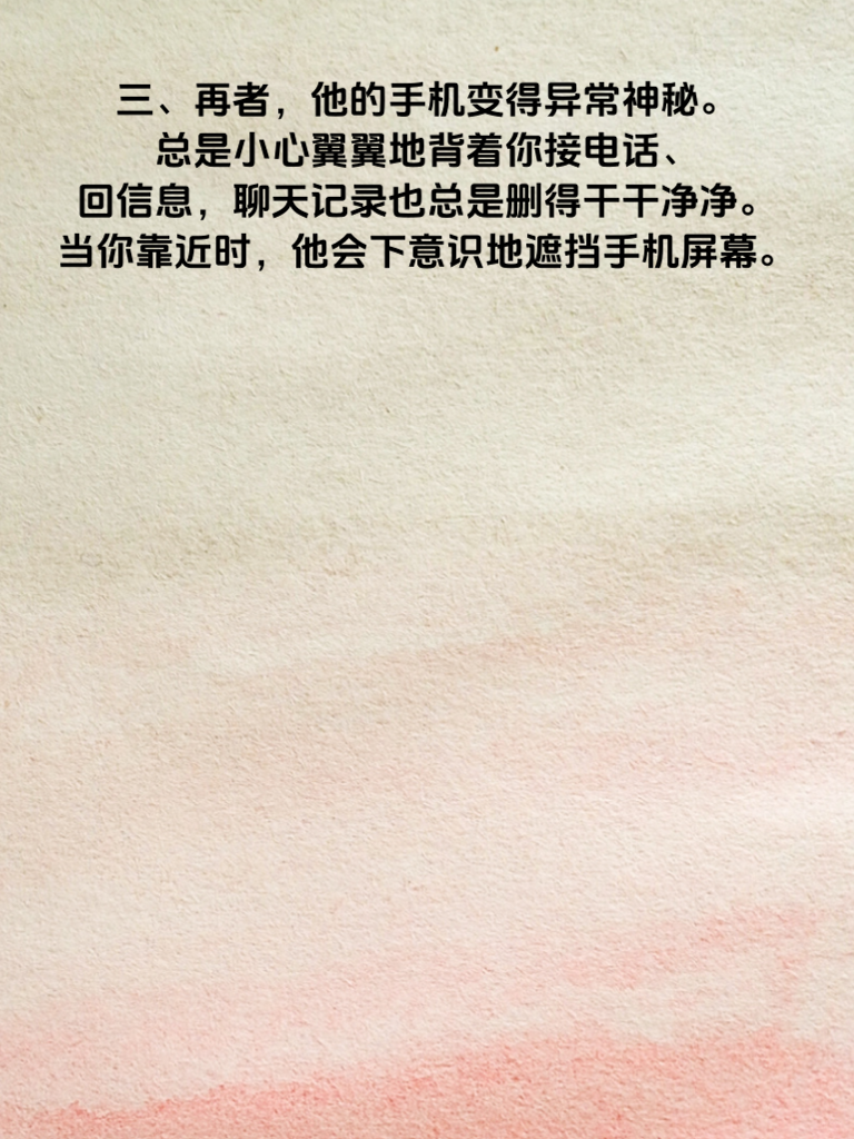 一、年轻男人出轨,身体会发出这几个预警。爱情,本应是忠贞不渝的承诺,然而现实中,却总有一些年轻男人在感情里迷失。当他们的心开始动摇,身体往往会先行一步发出信号。 二、首先,他们的日常行为会悄然改变。原本按时回家的他,开始频繁加班、应酬,回家时间越来越晚,对家里的事情也不再上心。曾经对你的喜好了如指掌,现在却常常忽略你的感受。 三、再者,他的手机变得异常神秘。总是小心翼翼地背着你接电话、回信息,聊天记录也总是删得干干净净。当你靠近时,他会下意识地遮挡手机屏幕。 四、还有,他的身体语言也会暴露端倪。和你相处时,眼神开始躲闪,不再像以前那样专注地看着你。拥抱和亲吻也变得敷衍,没有了往日的热情。 五、如果发现这些预警信号,不要慌张。冷静下来,找个合适的时机和他坦诚沟通,了解他内心的想法。爱情需要双方共同维护,及时发现问题,才能避免更大的伤害。