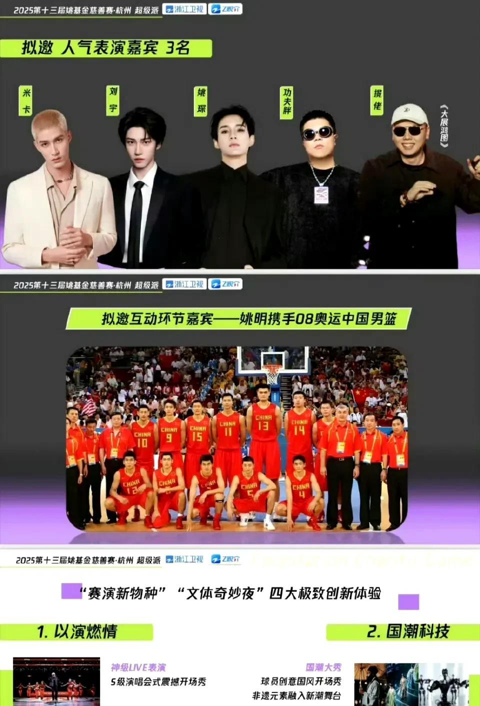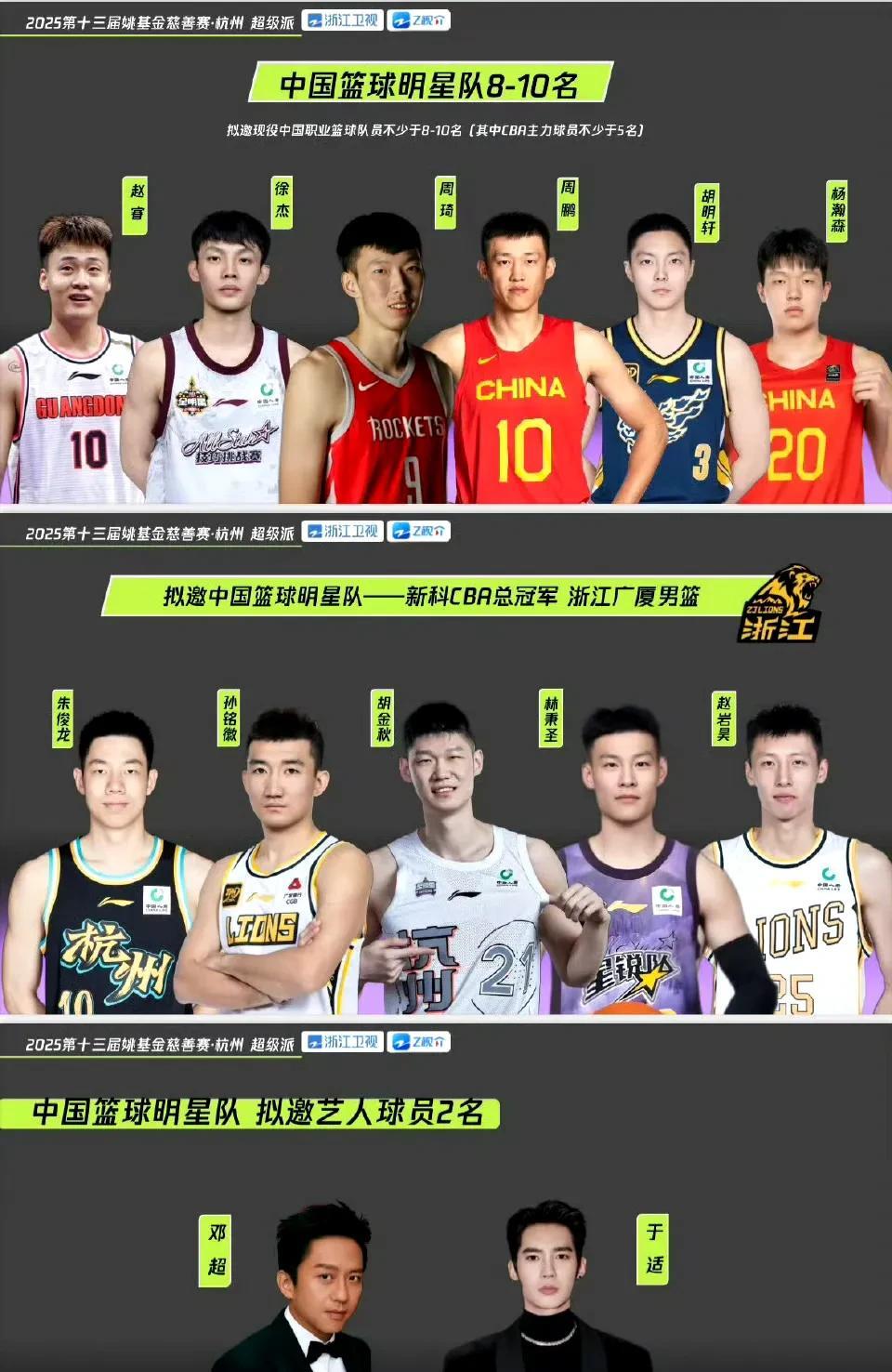杨翰森在列!2005姚基金慈善赛名单出炉! 2025年姚基金慈善赛将于8月15~18日在杭州奥体中心体育馆举行。受邀参加慈善赛的中国篮球明星队球员有周琦、杨翰森、徐杰、周鹏、赵睿、胡明轩,以及浙江广厦的孙铭徽、胡金秋、朱俊龙、赵岩昊、林秉圣。此外,还有邓超和于适两名艺人球员参加。 国际明星队方面,安东尼·爱德华兹、威斯布鲁克、库兹马等NBA球员将悉数亮相。 值得关注的是,本次姚基金慈善赛特别增加了一个环节,就是邀请08年北京奥运会中国男篮全体成员一起参与互动。 另外,韩红、邓超、于适、米卡等,以及挪威天后玛丽亚·亚瑞唐多,等艺人也将跨界参与。