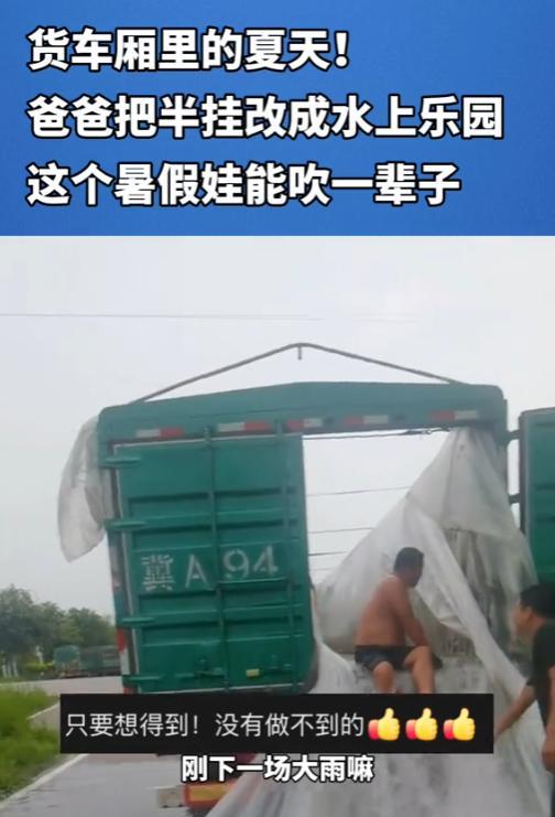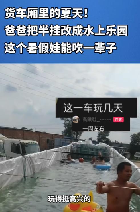“这个爸爸太聪明了!”7月14日,河北石家庄,男子为了给孩子消暑,花200元买了块塑料布,铺在家里的半挂车中,然后将水灌满,一个可移动的水上乐园就做好了。孩子不仅玩得高兴,而且还学会了游泳!网友:算不算浪费水资源? 不得不说,今年夏天是真热,像个大蒸笼,在外面走两步就浑身冒汗! 这名男子是开半挂车跑运输的,这段时间没有什么活,车就闲着,看着院子停着的车,想起儿子吵着要去水上乐园玩,他琢磨着,去水上乐园门票贵,人还多,天这么热,去了也遭罪,突然就有了主意。 第二天一早,男子就去批发市场200块钱买了块厚实的塑料布,回来仔细铺在半挂车的车厢里,边角用重物压实,又检查了好几遍确保不漏水,接着接了水管往里面灌水,大概灌到半米深的时候停了下来。 一个简易又安全的“移动水上乐园”就成了,孩子看到这一幕,眼睛都亮了,脱了鞋和衣服就进去扑腾,男子在旁边守着,教孩子划水、憋气,就这样玩了几天,孩子竟然真的都学会了基本的游泳动作。 说实在的,真是花小钱办大事,既能消暑又能学会游泳,比去外面人挤人强多了,不过,男子把孩子玩水的视频分享到网上后,也有人质疑水是不是太浪费了,直接就倒了。 面对争议,男子确实觉得有点,本来是想要将水去灌溉农地的,可因为当地下雨频繁,地里面已经有很多水,无奈之下,只得将水倒入大马路上,不过,水流进下水道,最终还会进行循环使用,不算浪费。 话说回来,这名父亲真的是很有想法,其实养孩子不一定非要花大钱,像这样动动脑筋,同样能让孩子开心。 信息来源:《货车厢里的夏天!爸爸把半挂改成水上乐园,这个暑假娃能吹一辈子。》襄阳帮女郎