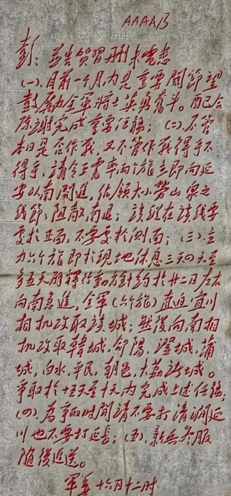 解放战争时期,主席给西北野战军司令员彭老总发的作战方案电报。