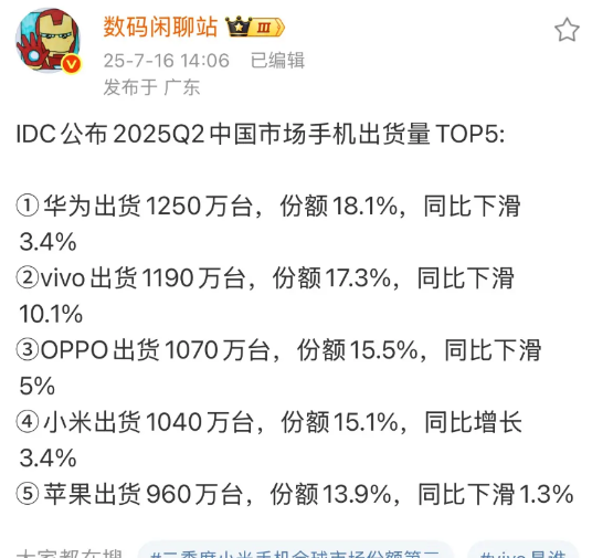 知名数码博主: 2025Q2中国市场手机出货量,华为排名第一!