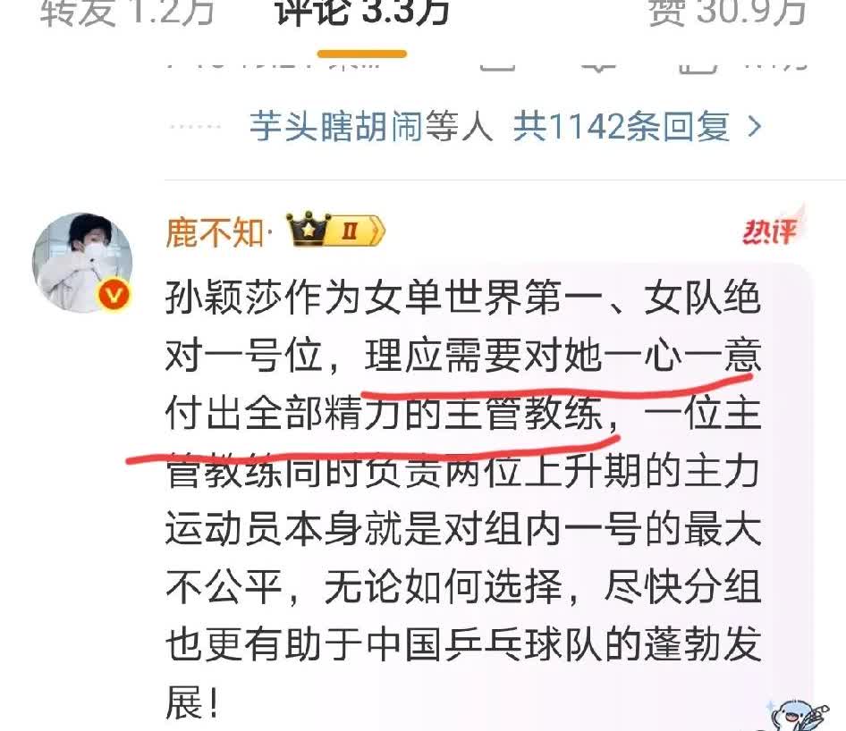 有好戏看了。这是孙颖莎的粉丝说的还是黑粉说的不可知。但是这个话题在亚洲杯的时候就有苗头了。 目前国乒女队的教练有邱贻可,李大成,徐辉,钟金勇,马俊峰这五位。蒯曼会选谁呢?孙颖莎会选谁呢?这五个教练每个人的手下都有四五个运动员。想让一个教练百分百的负责一个运动员,一对一,不分心不现实。就连大魔王张怡宁的主管教练李隼也只能分出百分之八十的精力给到她。孙颖莎即便一对一了。就能保证她洛杉矶的时候拿到单打冠军吗?如果不能岂不是让孙颖莎被骂得更惨吗?