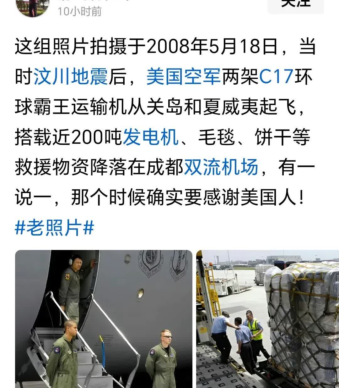 在汶川地震时,世界上许多国家都向中国提供了帮助,其中包括美国。中国政府和人民专门发表了声明,对所有帮助了中国的国家表示了感谢。 我们没有必要,过了17年以后,把美国援助的图片单独发出来。我们没有必要,过了17年,再次单独的去感谢美国。 这是舔狗的风格。