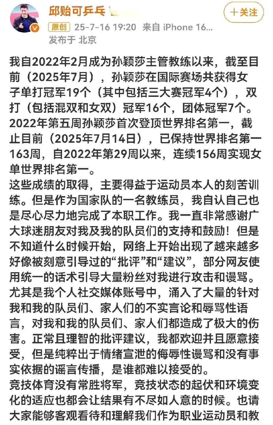邱贻可还是急眼了,昨天罕见发千字长文。主要内容如下: 1、罗列师徒合作以来,孙颖莎取得的成绩。(蔚为壮观,不再赘述) 2、面对部分球迷对自己无端指责谩骂,邱贻可给予驳斥和警告。 3、表明心志,继续努力!