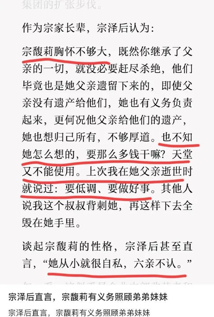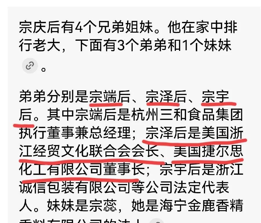 在宗馥莉与几个同父异母弟妹的遗产争夺之事里,有个人的吃相极为难看,绝非善类。 这个人便是宗馥莉的叔叔宗泽后。 每当宗馥莉身处困境之际,这个叔叔就冒了出来,对侄女宗馥莉进行打压、攻击、辱骂,言辞极为恶毒。 这哪像是一个叔叔、家中长辈对侄女该说的话呢? 即便你对这个侄女有诸多不满,又或者你们之间存在矛盾,可在这种大是大非面前,也应当保持沉默,不求你出来力挺这个侄女,起码也该闭上嘴。 宗泽后的这些言论,已然完全超出了人与人之间的普通矛盾范畴。 从这些言论能看出,宗泽后简直把宗馥莉视作仇家。 网上有传言称,宗泽后和杜建英的几个孩子面相极为相似。 宗泽后的公司在美国,他常年在美国活动。而杜建英生这几个孩子也是在美国,这就很让人怀疑了。 宗泽后极力打压宗馥莉,却力挺其他三人。 如果是宗泽后与宗庆后有矛盾,迁怒到哥哥的几个子女身上的话,那为何单单只打压宗馥莉,却对杜建英的孩子如此偏袒呢? 宗泽后的言论着实令人匪夷所思。 对此你怎么看。 #宗馥莉公主# #娃哈哈宗馥#