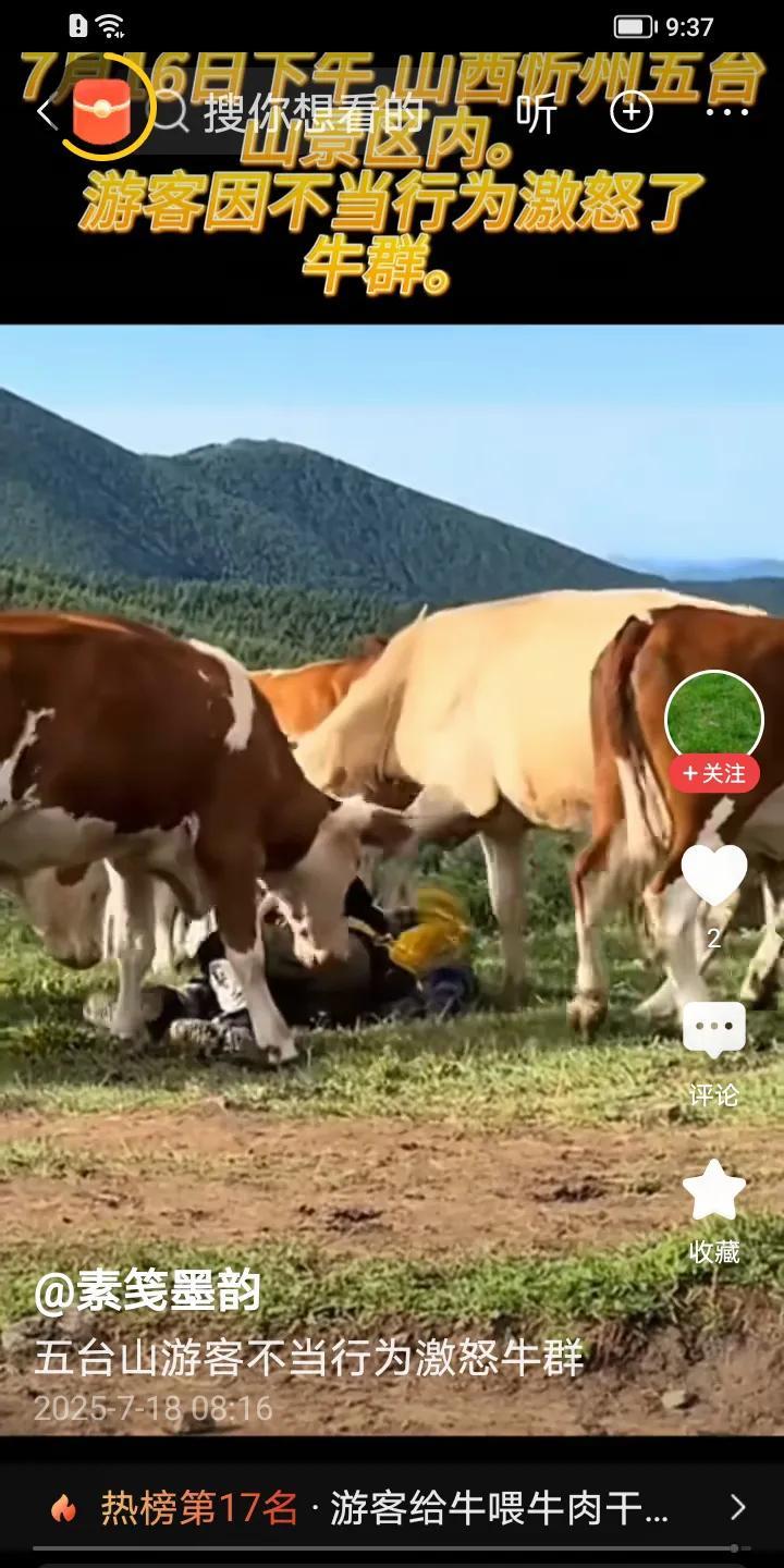 有一位前往五台山旅游的乘客,不知因何缘故,惹恼了五台山的牛群。牛群对这名游客发起了攻击,情形看起来凶多吉少,数头牛不停地踩踏该游客。这件事后续不知结果如何,看上去,这名游客恐怕会身负重伤,甚至可能有生命危险。外出旅游要避开危险,提高个人安全意识
