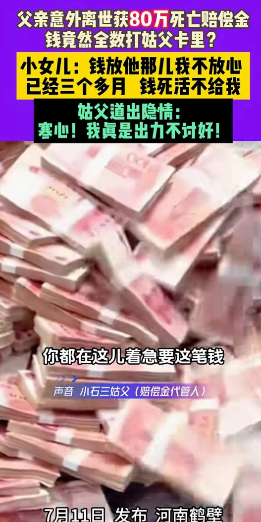 河南一女子父亲意外离世,获80万死亡赔偿金,可钱竟然全部打姑父卡里,而且,女子跟