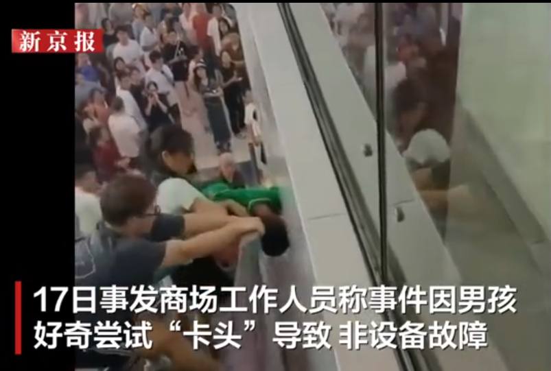 信息来源:《危险!男童因好奇将头卡在扶梯和墙体缝隙顾客按停扶梯合力解救卡头男童》新京报