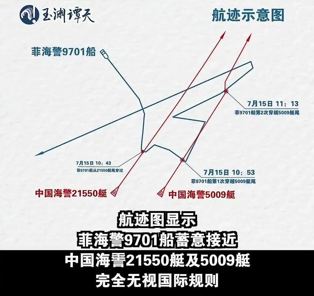 菲律宾下死手了!2600吨海警船高速冲撞中国巡逻艇,三次挑衅直奔“船毁人亡”?7月15日,黄岩岛海域惊现南海最危险一幕:菲律宾最大吨位的9701号海警舰,高速冲向我方百吨级海警艇21550与5009,三次从船尾穿插挑衅,试图制造撞击事故。 信源:搜狐军事——不再惯着!菲船3次撞击中方海警船,052D出击强行驶入菲巡航编队 南海的浪,最近不太平,而搅动这片海域的,是菲律宾愈发大胆的连番挑衅。7月15日在黄岩岛附近上演的一幕,尤其值得玩味。 当天上午,中国海警21550艇与5009艇正在黄岩岛海域依法巡航,这两艘都是百吨级的小艇。谁知菲律宾海岸警卫队那艘2300吨的9701船,突然高速冲了过来。 现场航迹图清晰显示,这艘大船多次以极其危险的大角度转向,径直切入中国海警艇的航线,最近时距离不过百米。 这种玩法,完全无视《国际海上避碰规则》。在海上,吨位就是话语权,如此悬殊的体格差距下搞这种“极限贴近”,一旦失控,小艇轻则重创,重则艇毁人亡。 这显然不是误操作,而是一次蓄谋已久的“高速冲撞”表演,意图很明确:逼中国海警动手,然后拿着“中方首先动武”的剧本,去国际上哭诉卖惨。 事实上,这种表演菲律B宾已经排练过多次。今年4月,菲海警4409船就在同一片海域对中国海警的中南舰玩过“碰瓷”摆拍。 那么问题来了,菲律宾为何如此有恃无恐,甚至到了不惜以卵击石的地步? 背后自然有外部势力的影子。美国等一些西方国家为了遏制中国,持续在南海问题上煽风点火,给菲律宾撑腰打气,递过去的“刀子”让马尼拉产生了自己可以叫板的幻觉。 不过,更深层的原因,恐怕要从菲律宾自己身上找。 马科斯政府正面临内外交困的窘境。外交上,7月初的东盟外长会上,菲律宾本想借黄岩岛问题闹一场,结果惨遭冷遇,各国更关心的是推进《南海行为准则》,这让菲律宾倍感孤立。 国内经济上,对美国“跪舔”两年,换来的却是特朗普加征的关税。政治上更是麻烦不断,国防部长特奥多罗深陷“双重护照”丑闻,面临违宪指控,民意暴跌。 为了转移国内矛盾,这位部长甚至抛出了让中国“主动放弃核武器”的荒谬言论,极力鼓动对抗。 对马科斯政府而言,这已经是一场赌上政权身家的豪赌。他们清楚,只有把事情闹大,甚至“激怒”中国,才有可能换取美国的实质性军事介入,从而为自己“续命”。 更值得警惕的是,菲律宾的挑衅已从南海蔓延至台海,试图两线联动。他们不仅允许官员窜访台湾,还与台海巡部门在巴士海峡搞联合巡逻。 菲军方负责人更是直言,一旦台海有事,菲律宾“不可避免地会介入”。此次海上冲撞,正是这一系列激进策略的延续。 但有一点菲律宾似乎忘了,如今的南海,早已不是十年前的局面。 中国海警船已经形成常态化在南海巡航执法的局面,2024年,中国海警对菲补给船的拦截率达90%,有效阻止了菲方对仁爱礁的非法补给。 2025年7月,中国海警在黄岩岛附近采用“诱敌深入+重舰待命”的战术,以两艘小型海警艇作为前哨,而大型海警舰艇与军舰随时待命,形成强大的威慑力。 中国海军拥有三艘航母,数量排名世界第二,其中福建舰采用先进的电磁弹射设计。此外,中国海军还拥有075型两栖攻击舰、055型导弹驱逐舰、几十艘潜艇等先进装备。 这些力量能够随时支援南海方向,对任何挑衅行为形成强大的军事威慑。 在空中力量方面,中国在南海岛礁部署了先进的雷达系统和电子侦察设备,能够实时监控周边海域和空域的动态 同时,中国空军和海军航空兵在南海周边部署了多种先进战机,包括歼-16等型号的战斗机。 在岛礁建设与防御方面,中国在南海岛礁上建设了现代化的机场、港口和通信设施,形成“南海堡垒群”。 同时,中国还部署了先进的防空导弹系统和反舰导弹系统,能够有效拦截来袭的导弹和飞机,保护岛礁的安全。 中国始终坚持“有理、有利、有节”的原则,通过军事与执法威慑、外交与法理斗争、经济合作与制裁双轨制等多种手段,应对菲律宾的挑衅行为。 南海是主场,不是谁想来撒野就来的舞台。过去,中国或许更多是克制与让步,但现在,面对屡教不改的挑衅者,是时候立规矩、画红线了。