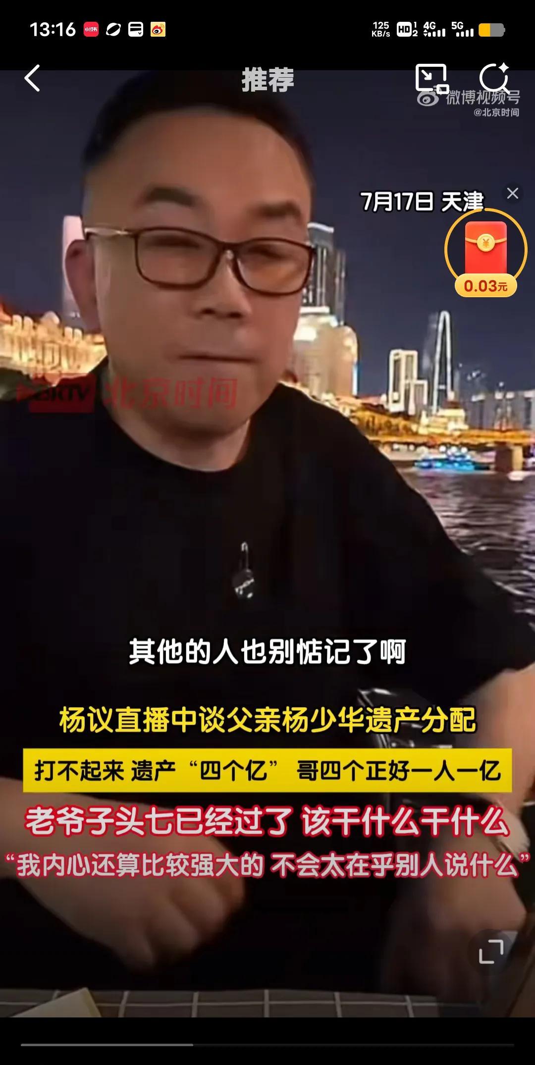 7月17日天津,杨议直播时谈及父亲杨少华的遗产分配,称“放心,打不起来,老爷子遗产‘四个亿’,哥四个正好一人一亿”。他还表示自己内心较强,不太在乎他人议论,父亲头七已过,工作会继续,该干啥干啥。