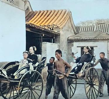 民国,上海一位洋车夫拉着一对时髦的夫妇。男子的头发上打着发蜡,梳着时髦的发型,穿
