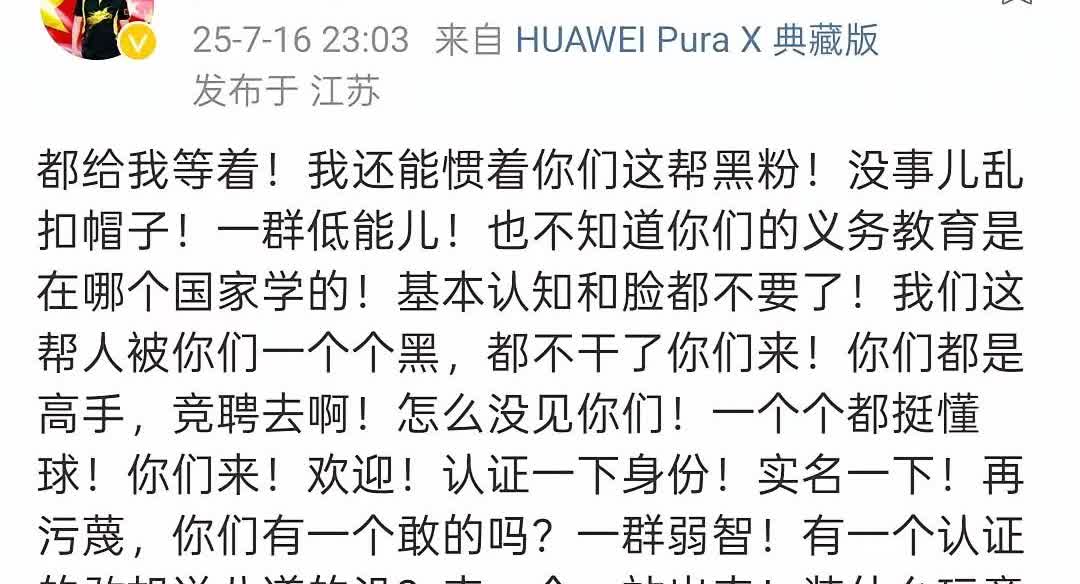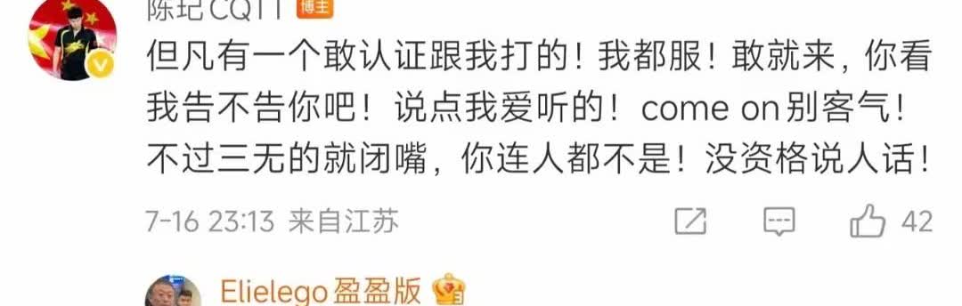 陈玘又发文炮轰黑粉, 可能是陈玘不在国家队, 言论可以更自由更犀利吧。 也可能就有些“杀神”之名的陈玘, 性子火爆,眼里不容一点沙子吧。 他的诉求就是想出来黑的, 实名来战!直面硬刚! 和邱贻可的摆事实讲道理的文风, 截然不同, 没有铺垫,上来就干![捂脸] 这一泼我占陈玘邱贻可, 一场大赛回来, 又把教练竞聘搞风搞雨, 作为球迷也好,粉丝也罢, 这种行为也不能算是真爱, 难怪陈玘也出来骂了。[捂脸] 图片来自网络侵删