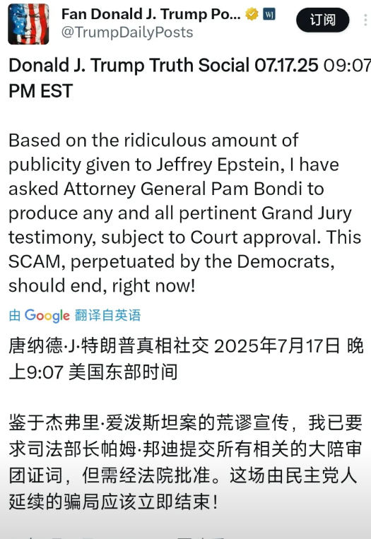 突发新闻:特朗普今天(北京时间7月18日)写道:“鉴于杰弗里·爱泼斯坦案的荒谬宣传,我已要求司法部长帕姆·邦迪提交所有相关的大陪审团证词,但需经法院批准。 这场由民主党人延续的骗局应该立即结束!”