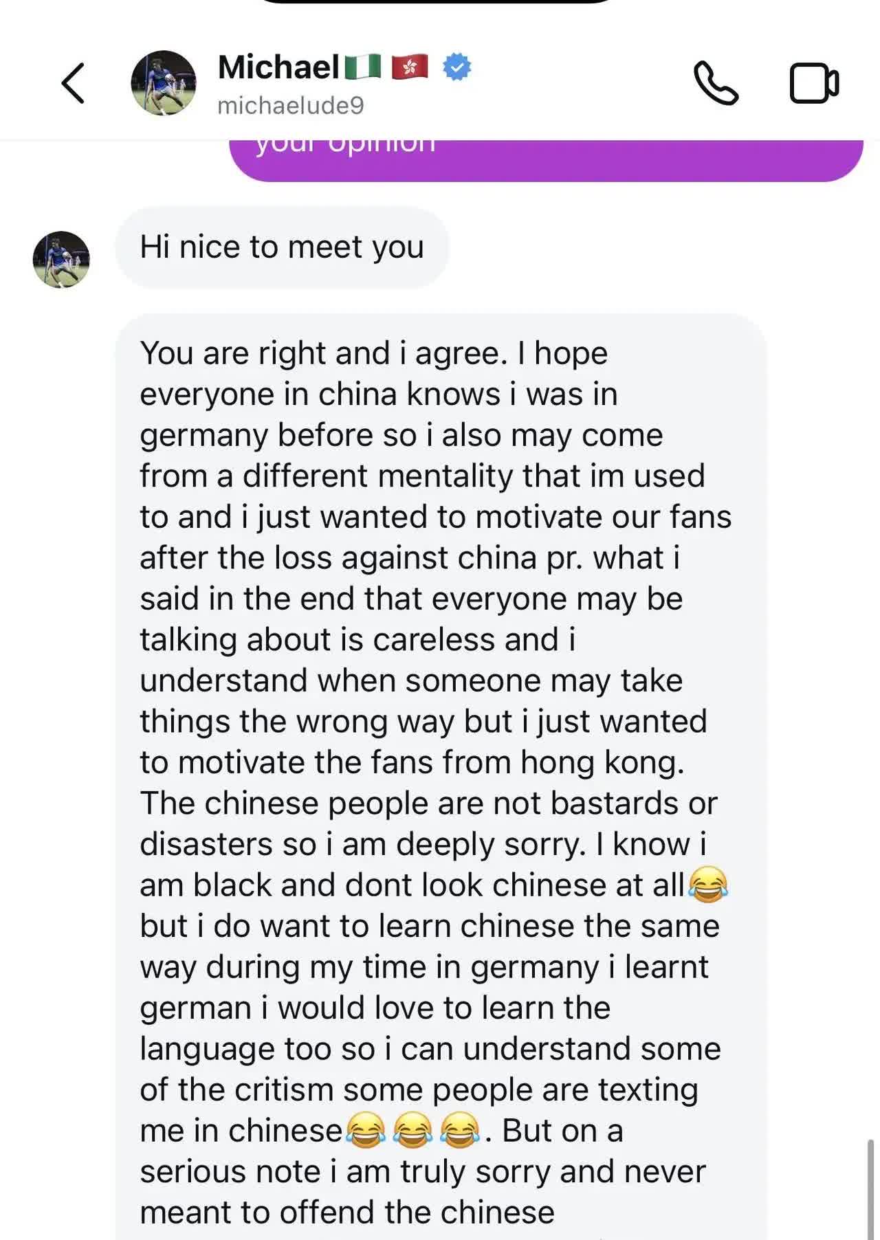 香港闯祸的球员米高要被苏州东吴解约了。真是大快人心啊。 反正他这辈子是没机会来国内踢球了。典型的祸从口出,就是可惜了那点违约金。为苏州东吴点赞👍。 出现这种事,我估计咱们国内的俱乐部都会选择解约,爱国这一点上咱们永远是团结一致的。 这货还有脸还道歉,如果道歉有用要警察做什么? 这件事也间接的警告一下在中超踢球的其他香港籍的球员嘴上都给我老实点。