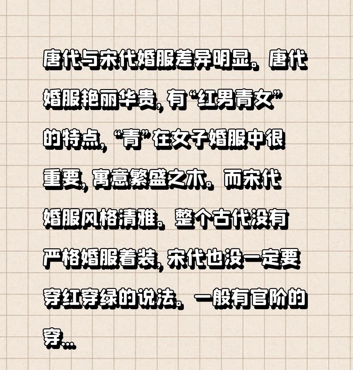 唐代与宋代婚服差异明显。唐代婚服艳丽华贵,有“红男青女”的特点,“青”在女子婚服中很重要,寓意繁盛之木。 而宋代婚服风格清雅。整个古代没有严格婚服着装,宋代也没一定要穿红穿绿的说法。一般有官阶的穿官服,普通百姓在特许时期能穿低等级命妇服装。宋代官服最低阶是绿袍,新晋进士会赐绿袍,但女子不一定要跟着穿绿。