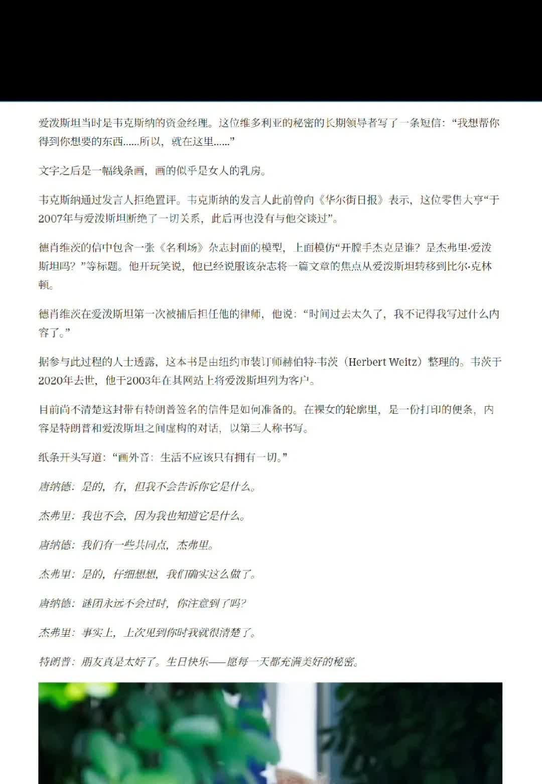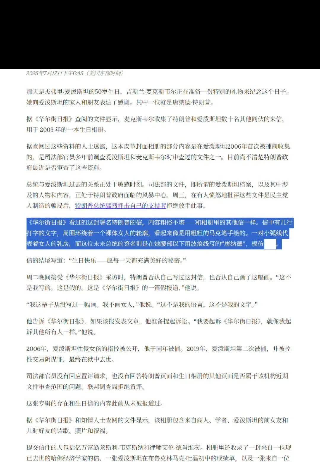 🔻华尔街日报曝光:特朗普给爱泼斯坦50岁的生日写了一封极其下流的贺信。 🔻