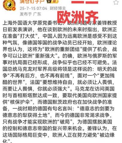 世界局势早已在“暗流涌动”!上海外国语大学欧洲问题专家姜锋教授日前发表演讲,他在谈到欧洲的未来时指出,欧洲正在“准备打大仗”,中国人因为远离欧洲是感受不到这种气氛,像德国等国的战争动员已经开始,欧洲理论界也认为,这将为“欧洲的重新团结”提供了机会,战争可以让欧洲“重新强大”...... 现在的欧洲也有些“腰杆子硬起来”的感觉,但是它“硬”的不是时候,“硬”的事情上也不对。 在特朗普宣布要向乌克兰支援进攻性武器之前,欧洲的法英两国不还是还要在停火后去往乌克兰驻扎部队吗。 现在有消息称德国也在进行战争准备,这场以俄乌冲突为跳板的大战真的已经是“箭在弦上”了,这也就导致整个世界局势都开始紧张起来了。 我国虽然不期待这样的事情发生,但是该做的国防准备还是要做的,避免让一些心存侥幸的国家有可乘之机,试图威胁我国的国家安全。