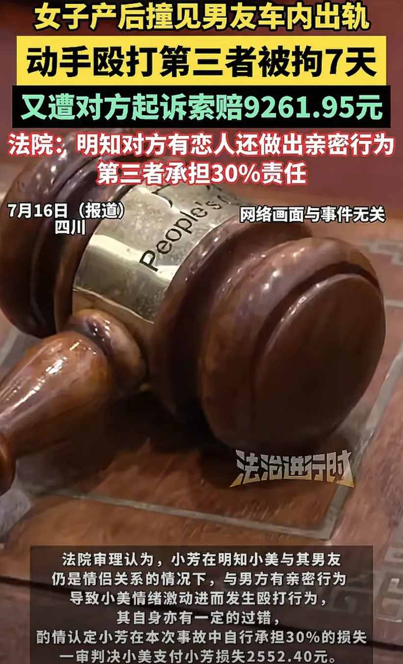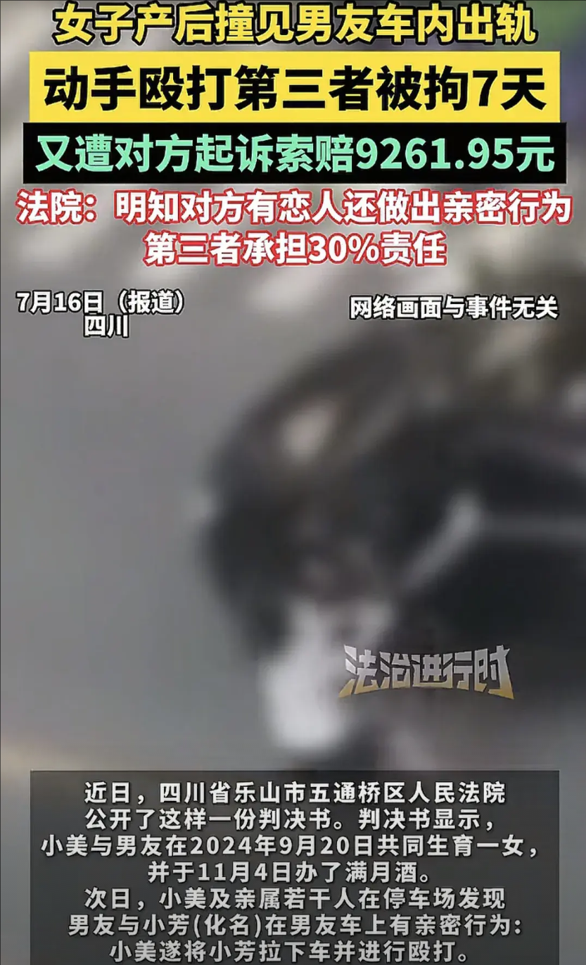 四川乐山,女子给孩子办完满月酒,第2天,和亲戚在停车场,看到小3坐在男友腿上,衣衫不整,女子大怒,将小3拉下车揍了一顿,结果女子被拘留7天,罚款300元,不料,小3起诉女子,索赔9261.95元,法院判决让人意外。