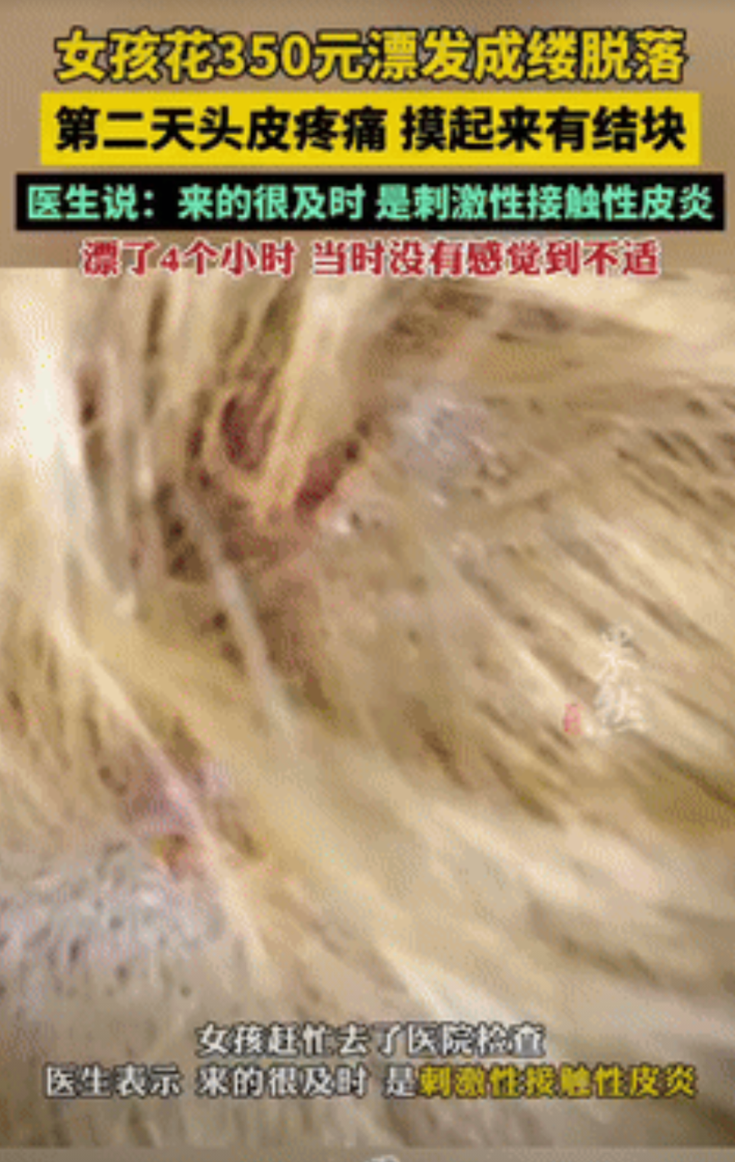 一开始她以为只是头发中段断掉,可第二天早上,头皮不仅疼得厉害,摸上去还有结块。去医院一检查,被诊断为刺激性接触性皮炎。网友:“漂4个小时,头皮都快被烫熟了吧!”