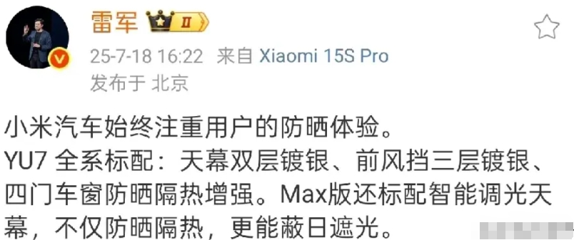 余承东快来学学,雷老板又在宣传YU7的防晒能力了。 余承东曾于享界之夜上自嘲不擅